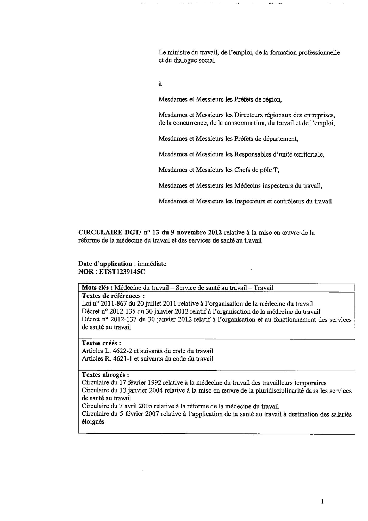 La DGT a publié la circulaire relative à la mise en œuvre de la réforme de la médecine du travail et des services de santé au travail.