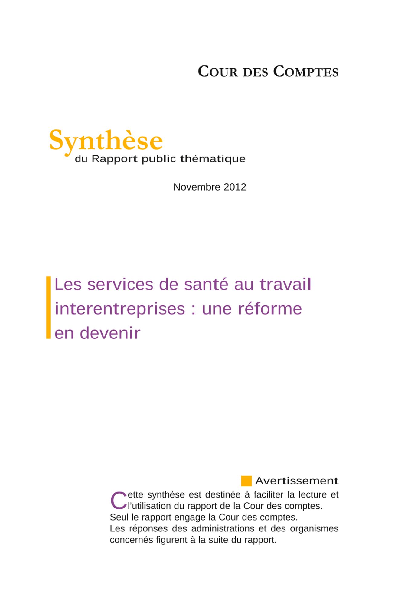 Dans ce document, la Cour des comptes revient notamment sur la loi du 20 juillet 2011, qui s’inscrit dans le mouvement de transformation de la médecine du travail en un ensemble plus large, la santé au travail, visant à passer d’une action dirigée vers l’assurance de l’aptitude au travail à la prévention des pathologies professionnelles.
