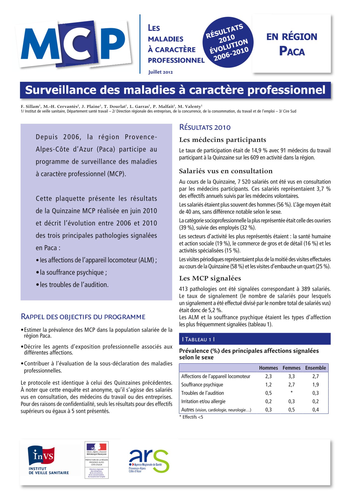 Depuis 2006, la région Provence-Alpes-Côte d’Azur (Paca) participe au programme de surveillance des maladies à caractère professionnel (MCP).