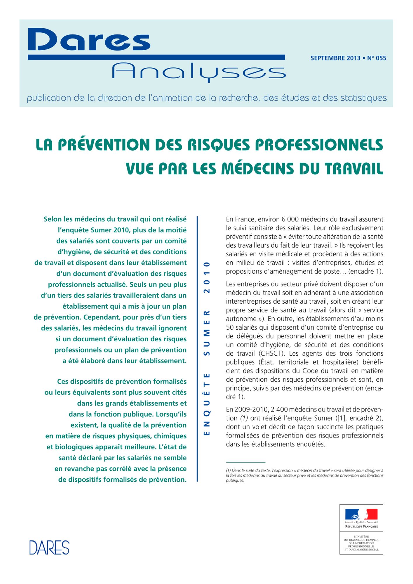 La DARES (Direction de l'animation de la recherche, des études et des statistiques - organe du Ministère du travail, de l'emploi, de la formation professionnelle et du dialogue social) a publié une étude sur la prévention des risques professionnels vue par les médecins du travail.