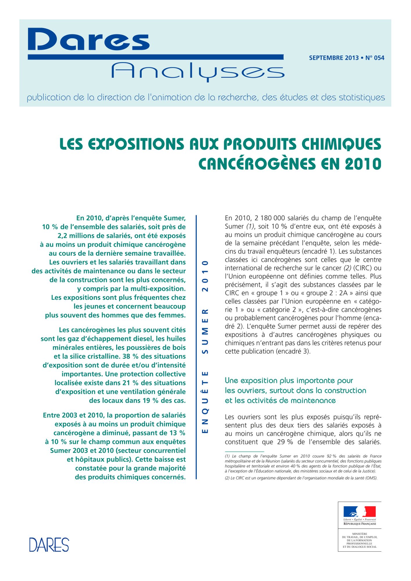 En 2010, d’après l’enquête Sumer, 10 % de l’ensemble des salariés, soit près de 2,2 millions de salariés, ont été exposés à au moins un produit chimique cancérogène au cours de la dernière semaine travaillée...