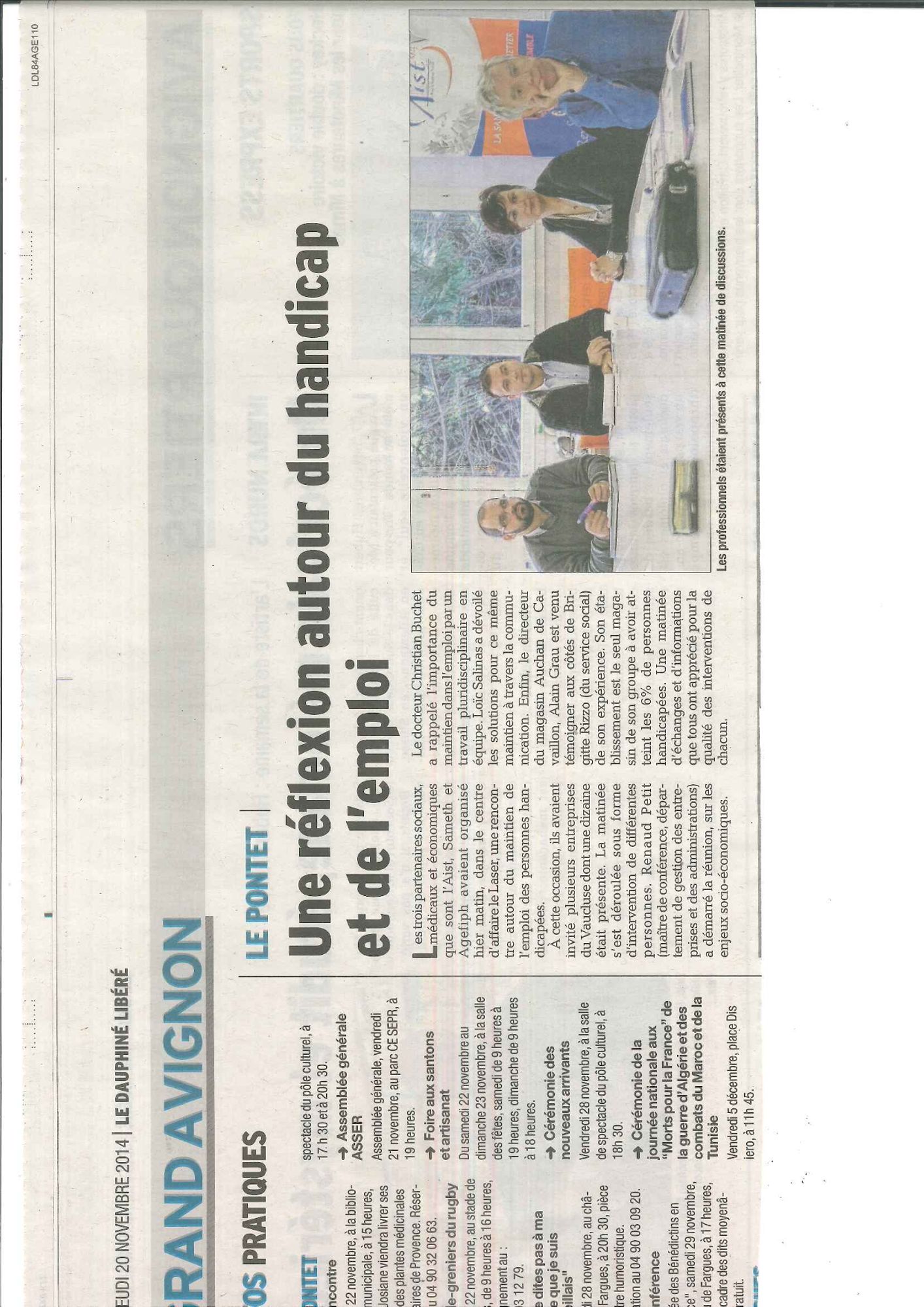 Dans le cadre de la semaine pour l'emploi des personnes handicapées, l’AIST84, le SAMETH84 et le Service social Conseil ont organisé une matinée d'information le 18 novembre 2014 ayant pour thème : "Maintien dans l'emploi : prévention des risques et impact sur la santé de vos salariés et de votre entreprise".