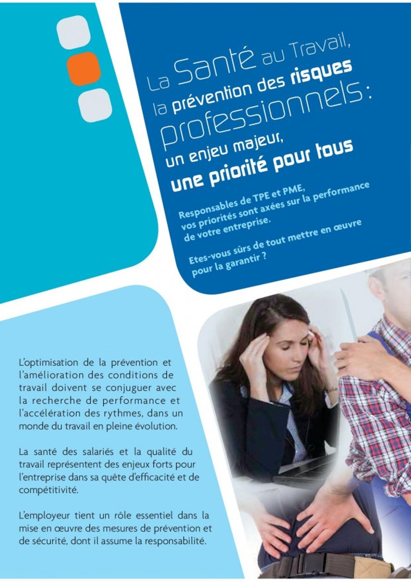 La santé des salariés et la qualité du travail représentent des enjeux forts pour l’entreprise dans sa quête d’efficacité et de compétitivité. L’employeur tient un rôle essentiel dans la mise en oeuvre des mesures de prévention et de sécurité, dont il assume la responsabilité.