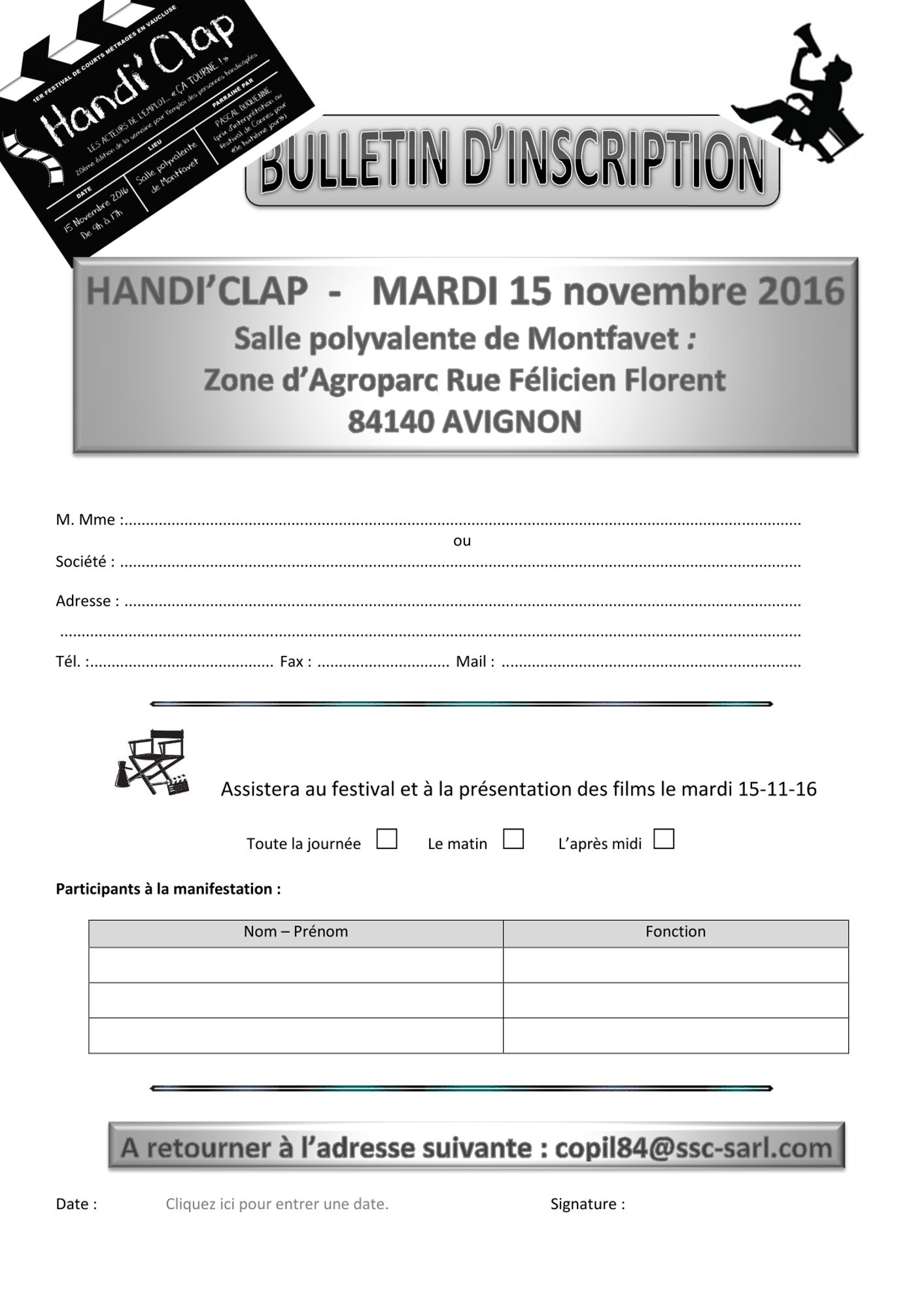 Les personnes souhaitant assister au Festival Handi'clap doivent retourner le bulletin d'inscription à copil84@ssc-sarl.com