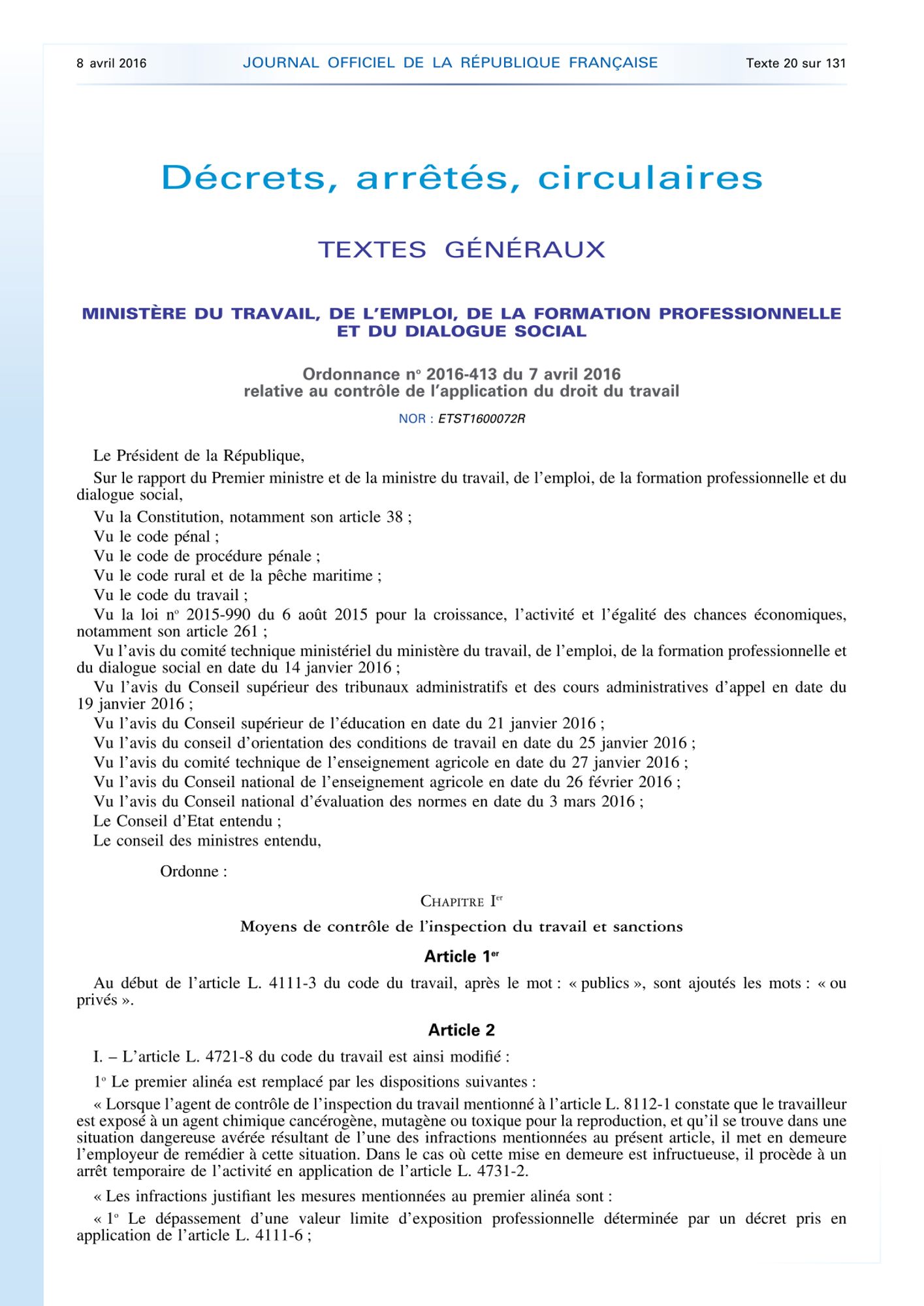 L'ordonnance du 7 avril 2016 prévoit par ailleurs plusieurs mesures concernant les jeunes travailleurs (d'au moins 15 ans et de moins de 18 ans), avec des procédures d'urgences. Ainsi, l'agent de l'inspection du travail peut dorénavant retirer immédiatement un salarié mineur de son poste s'il constate qu'il effectue des travaux interdits ou l'exposant à des dangers pour sa vie et sa santé. Ce retrait peut s'accompagner d'une suspension du contrat de travail sans perte de rémunération pour le salarié.