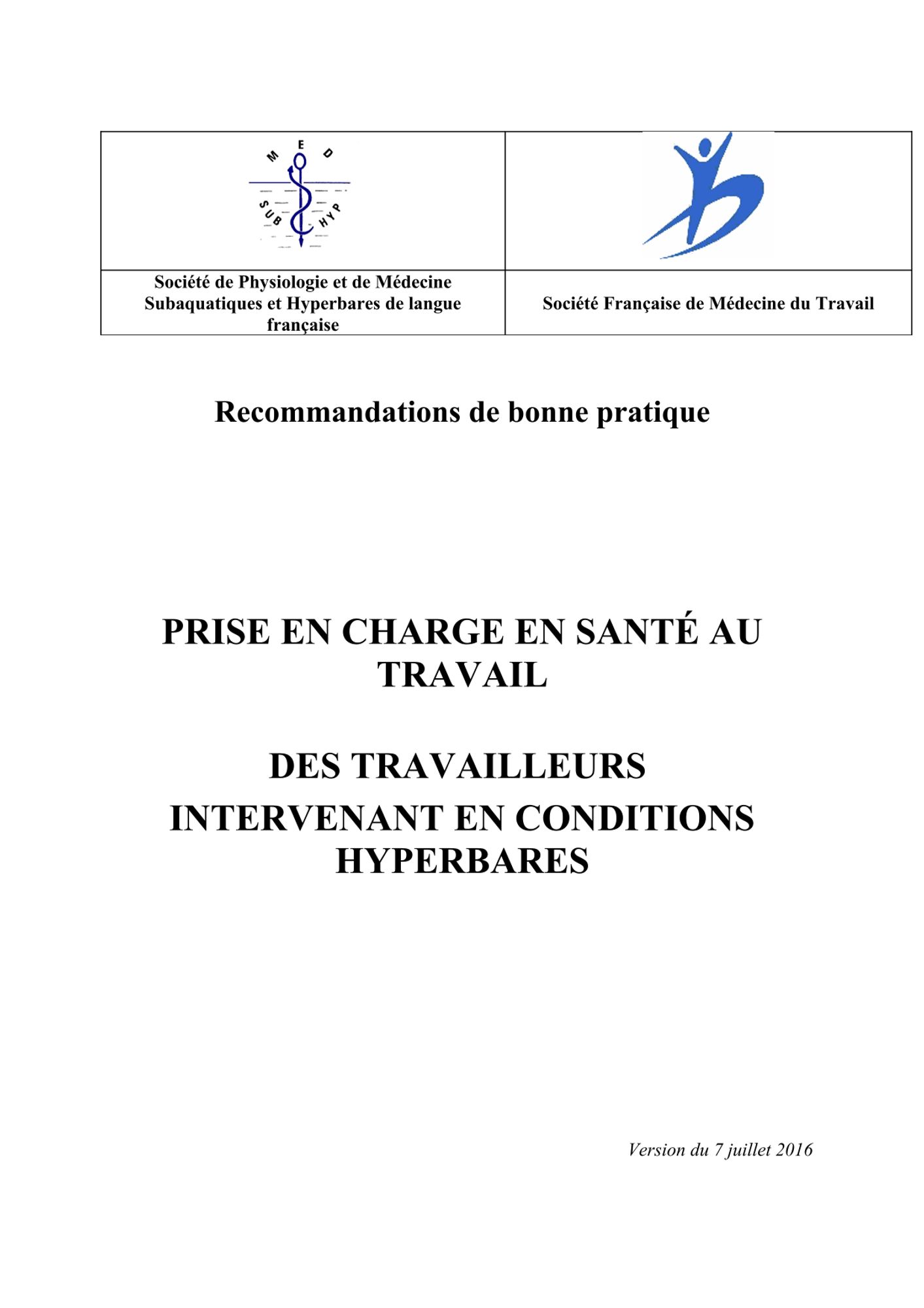 La Société française de médecine du travail a validé, le 7 juillet 2016, les recommandations de bonne pratique pour la prise en charge en santé au travail des travailleurs intervenant en conditions hyperbares.