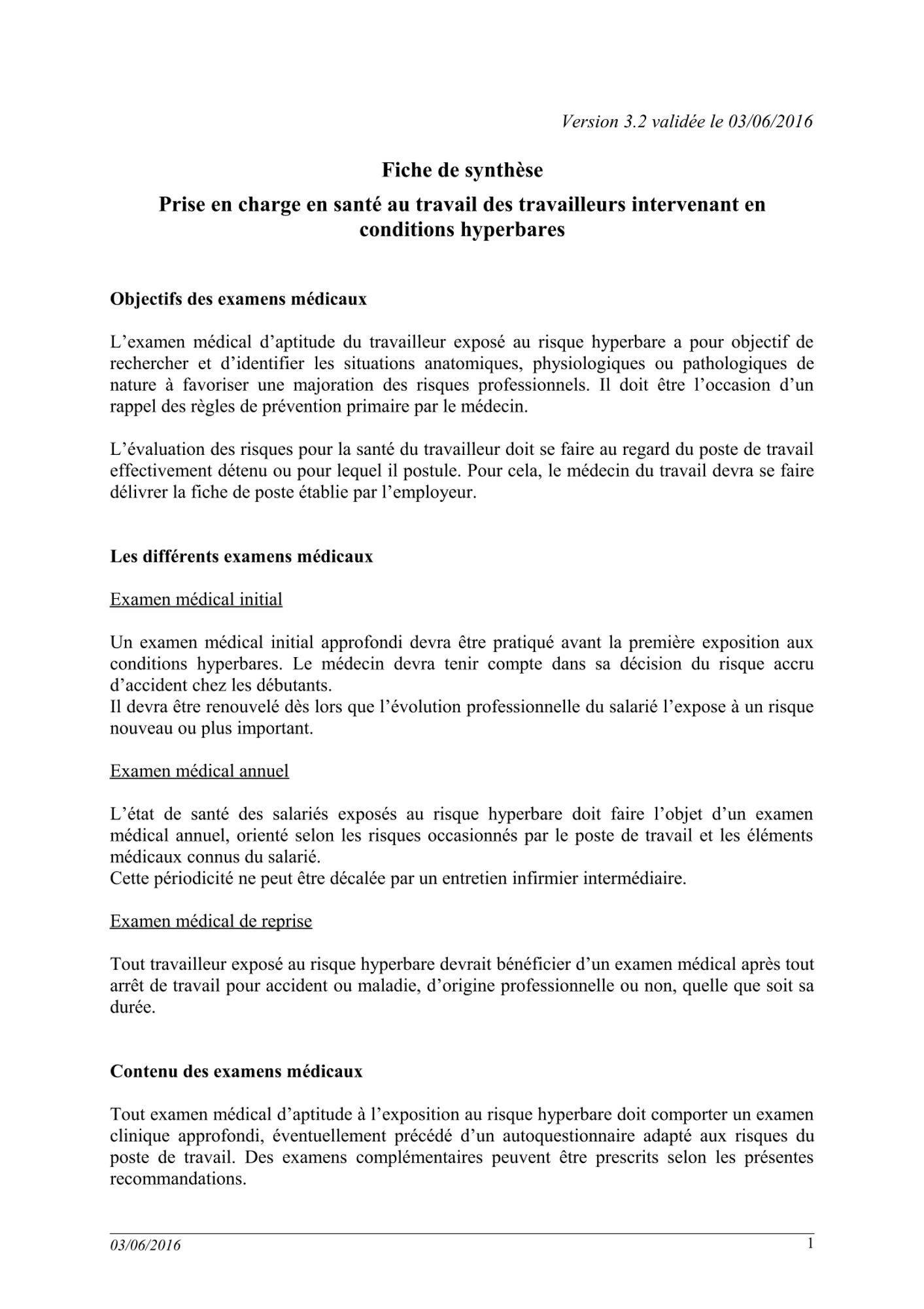 Établies par l'association MedSubHyp (dite "Société de Physiologie et de Médecine Subaquatiques et Hyperbares de langue française"), ces recommandations reflètent les avis d'experts fondés sur des connaissances ayant fait l'objet de publications scientifiques. Elles n'ont pas de caractère réglementaire. En effet, selon le Code du travail, les médecins du travail choisissent de les appliquer ou non, et restent libres de leurs prescriptions d'examens complémentaires. En cas de recours, la non-application devra être argumentée. En revanche, il ne pourra pas être tenu rigueur au médecin du travail d'en faire davantage.