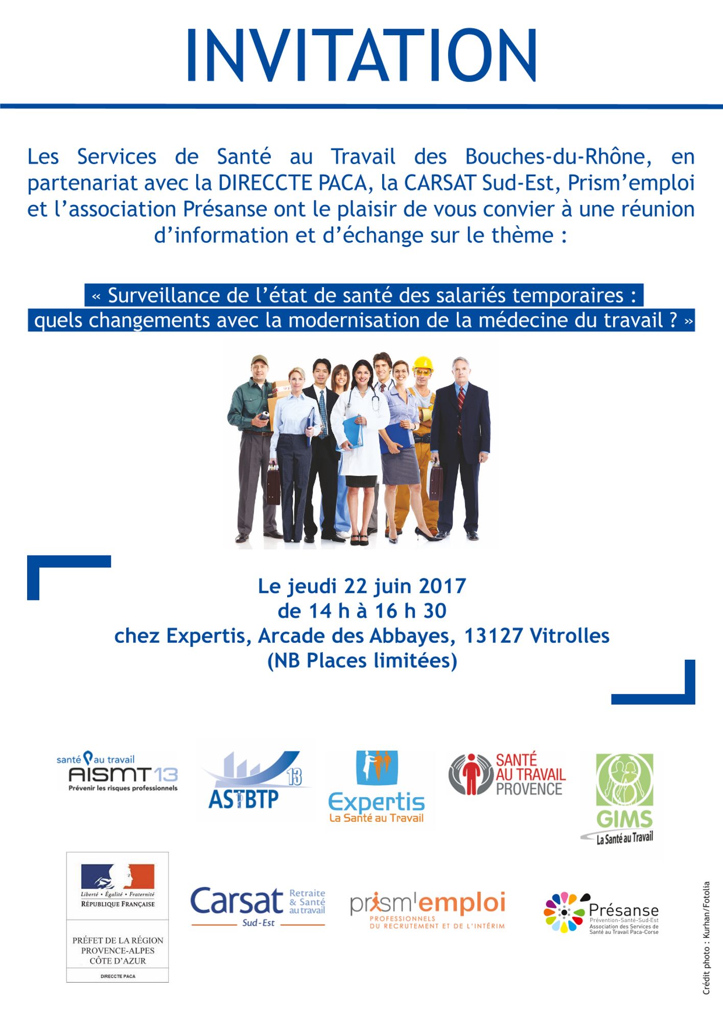 - Inscriptions : réunion réservée aux agences d'emploi adhérentes des 5 Services de Santé au Travail des Bouches-du-Rhône (AISMT 13, AST BTP 13, Expertis, ST-Provence, GIMS 13). Places limitées.
