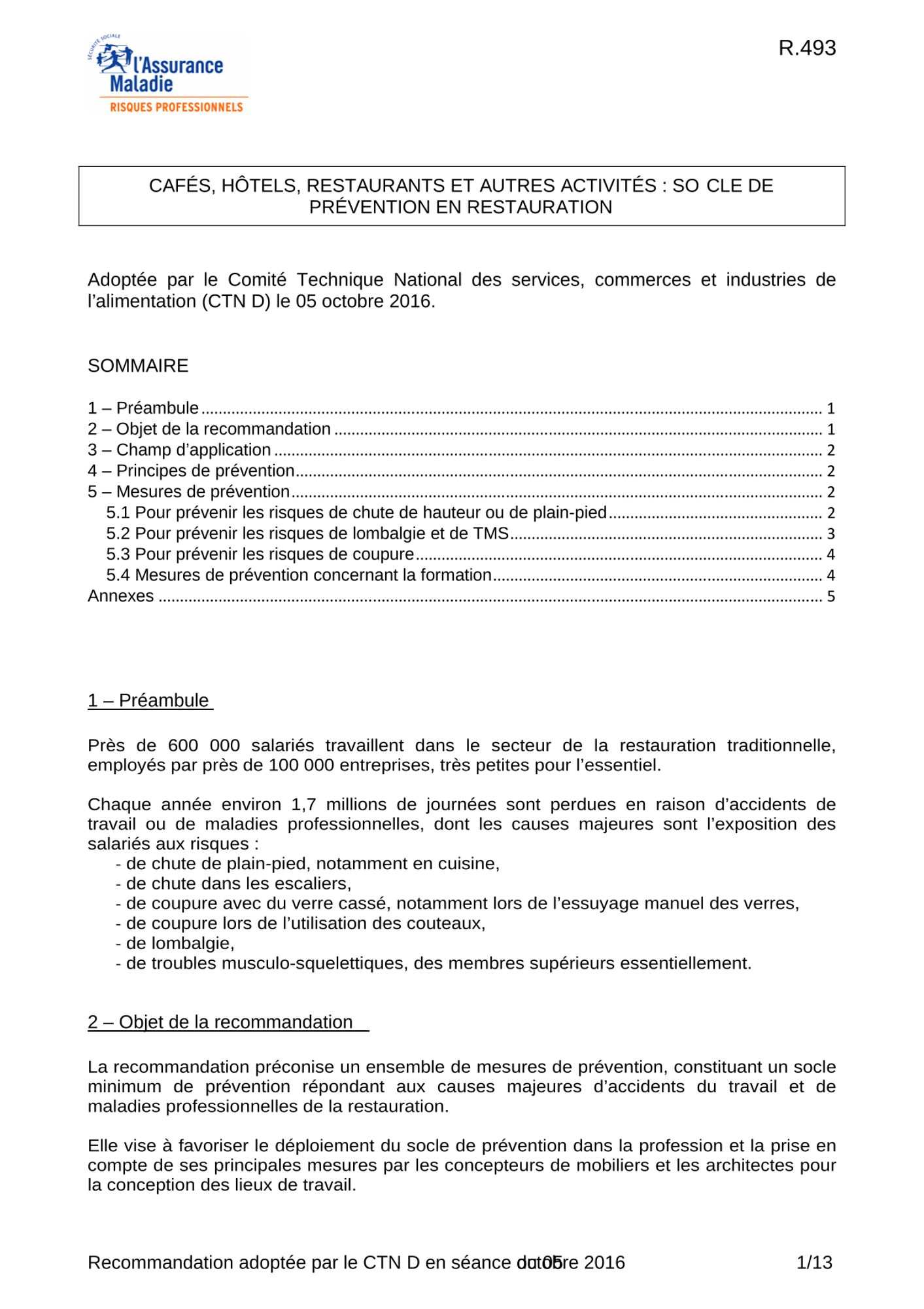 Adoptée par le Comité Technique National des services, commerces et industries de l'alimentation, la recommandation R493 constitue un ensemble de mesures de prévention pour éviter les accidents du travail et de maladies professionnelles dans le secteur de la restauration.