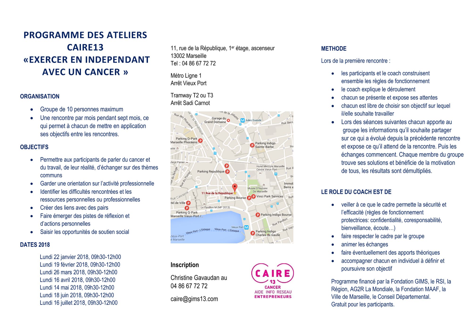 - Ateliers entièrement gratuits, sur inscription seulement (nombre de places limité) auprès de Christine Gavaudan, tél. 07 53 09 06 18 ; caire@gims13.com