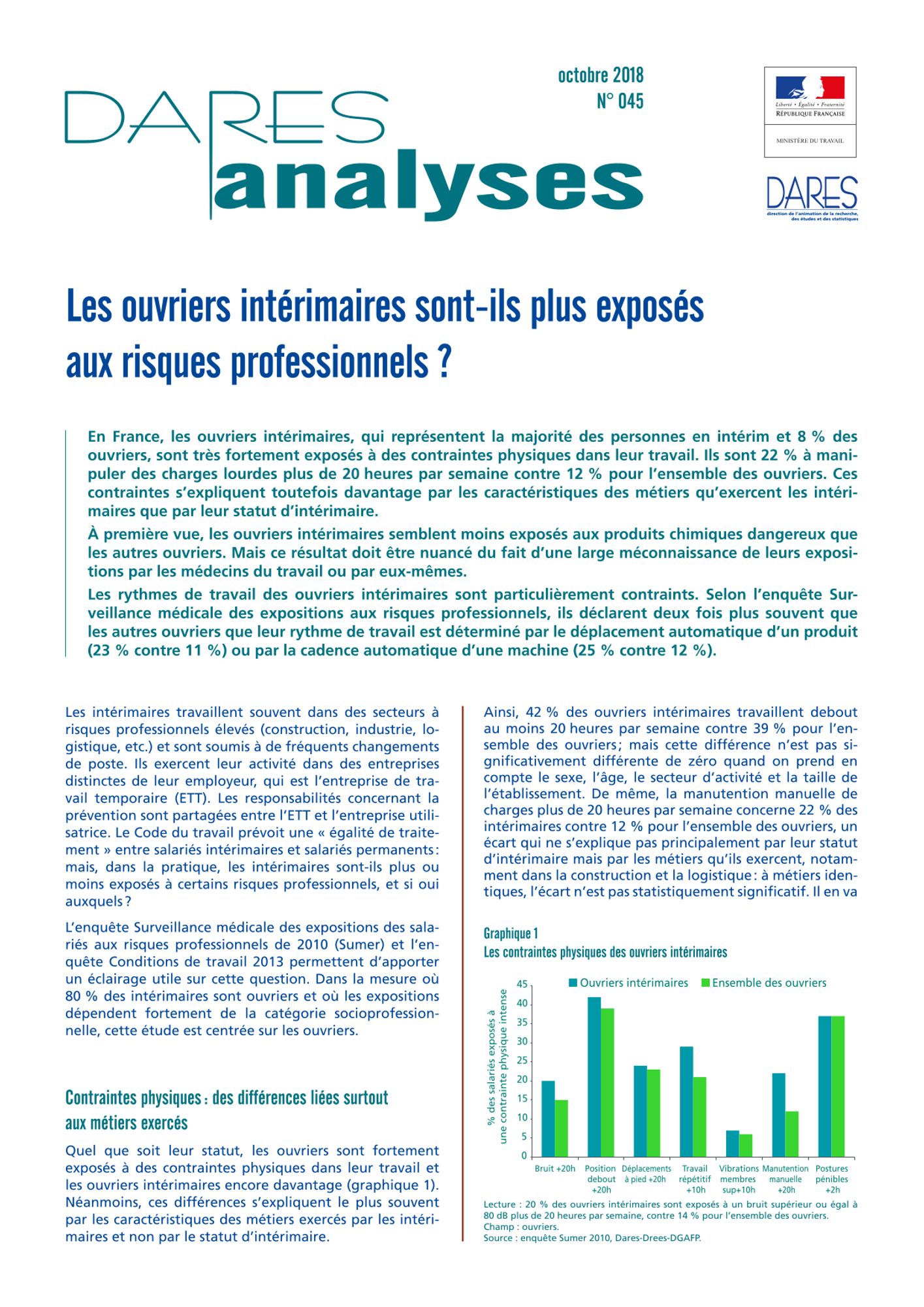 La Direction de l'animation de la recherche, des études et des statistiques (Dares) du ministère du Travail a publié, en octobre 2018, une étude sur l'exposition des ouvriers intérimaires aux risques professionnels. Contraintes physiques et rythmes de travail élevés arrivent en tête des expositions.
