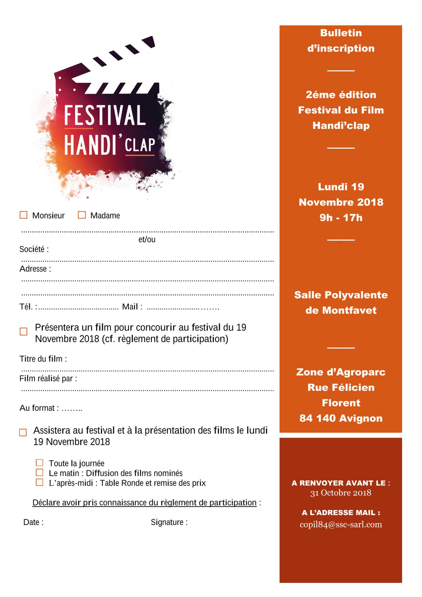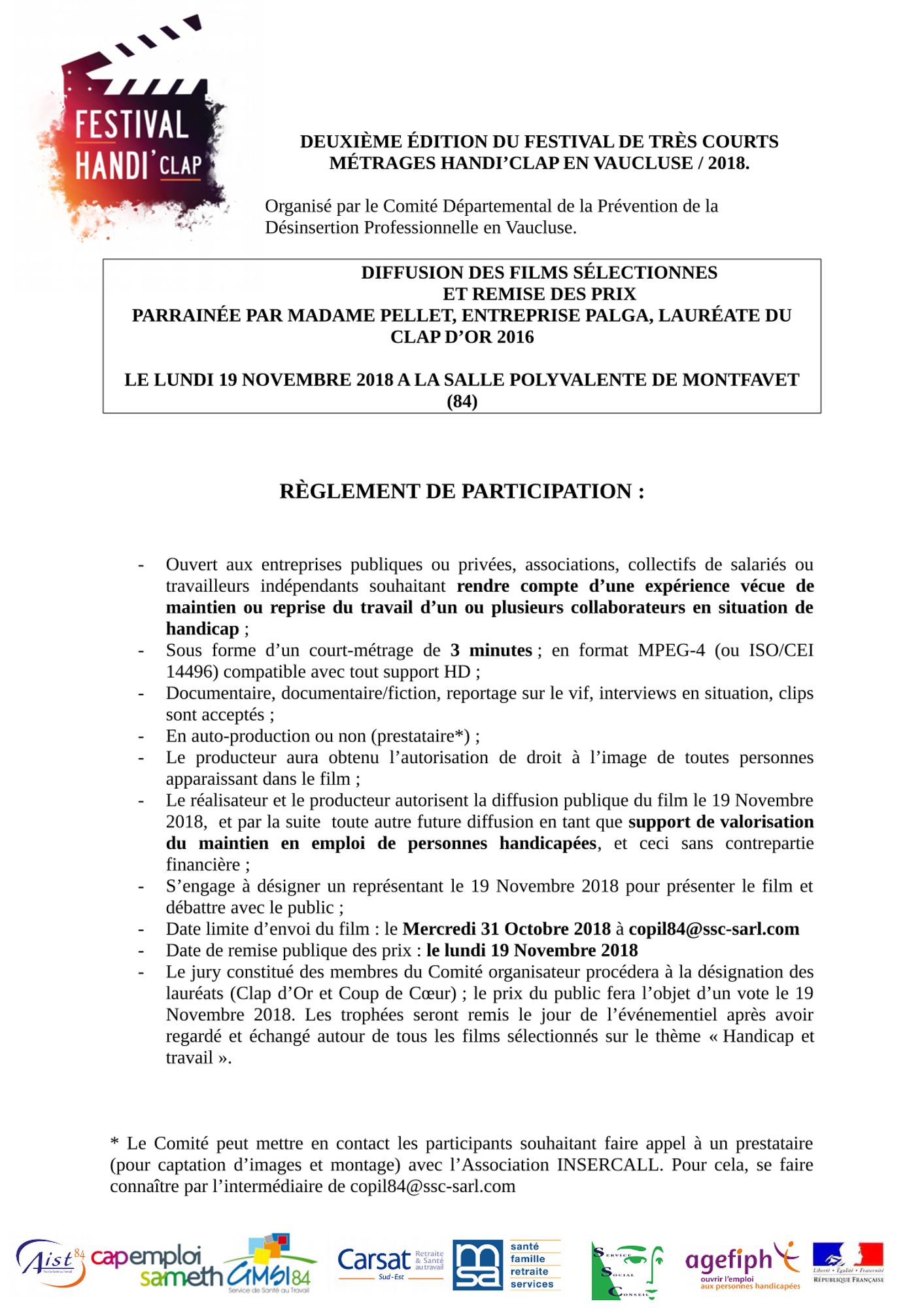 La 2e édition du festival de courts-métrages Handi'Clap se tiendra le lundi 19 novembre 2018 à Montfavet, dans le Vaucluse. Objectif : mettre à l'honneur, à l'aide de petits films, des situations montrant des salariés et/ou employeurs qui ont pu reprendre le travail malgré le handicap.