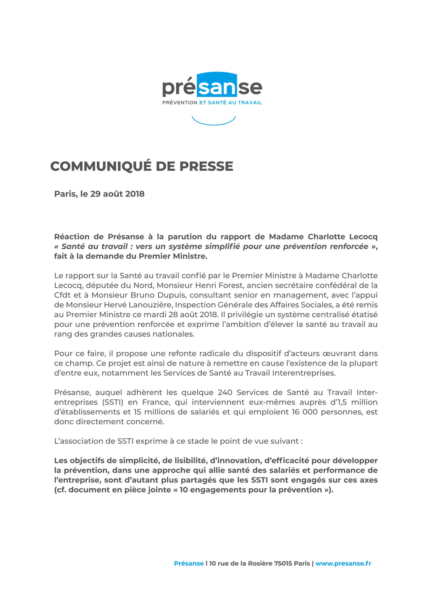 L'association des SSTI y fait état de son point de vue, en rappelant que "les objectifs de simplicité, de lisibilité, d’innovation, d’efficacité pour développer la prévention, dans une approche qui allie santé des salariés et performance de l’entreprise, sont d’autant plus partagés que les SSTI sont engagés sur ces axes". À ce propos, Présanse avait notamment publié un document intitulé "10 engagements pour la prévention".