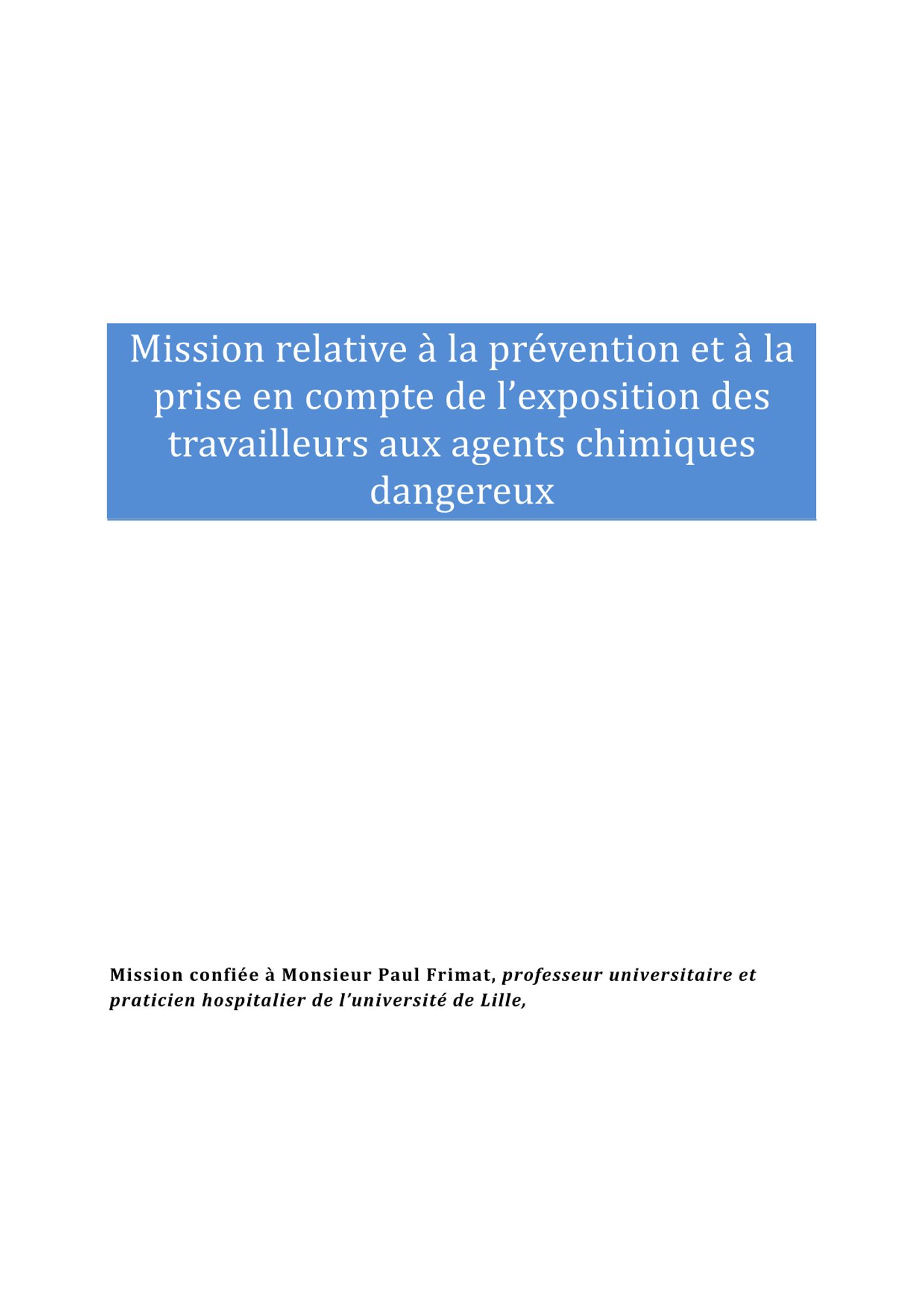 À la demande du gouvernement, le Professeur Paul Frimat (professeur des universités et praticien hospitalier de l'université de Lille, spécialiste de la santé au travail) a rédigé un rapport sur la prévention et la prise en compte de l'exposition des travailleurs aux agents chimiques dangereux.