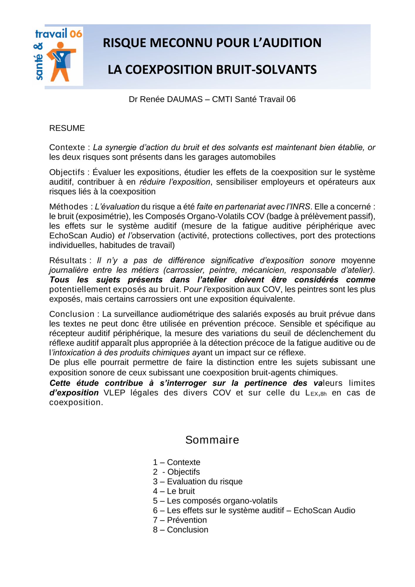- Contexte : La synergie d’action du bruit et des solvants est maintenant bien établie, or les deux risques sont présents dans les garages automobiles.