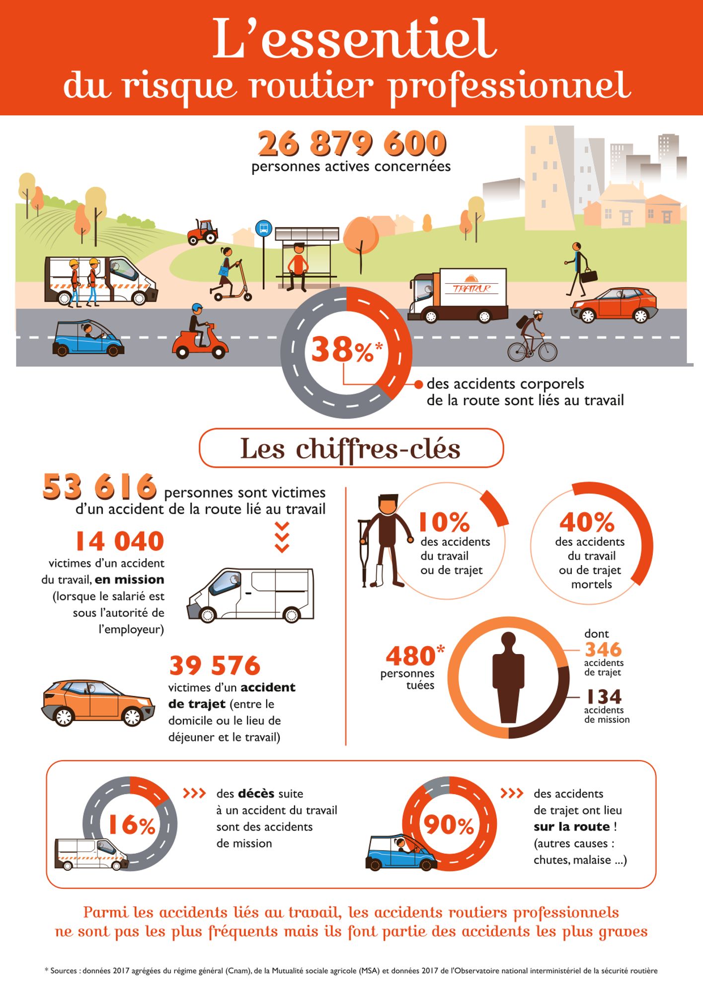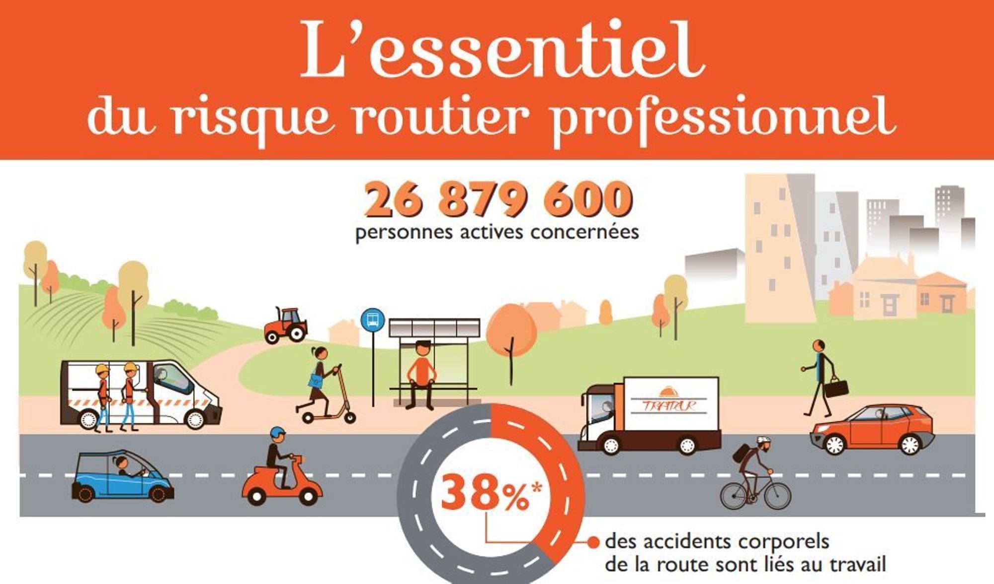 Identifié comme un des risques prioritaires du troisième plan santé au travail 2016-2020 et comme une priorité de la politique de la sécurité routière pour la période 2018-2022, le risque routier professionnel fait aujourd'hui l'objet d'une infographie très parlante, fruit d'un travail de plusieurs partenaires institutionnels. Cette infographie s’accompagne d’un tableau de bord plus complet rassemblant l’ensemble des indicateurs sur le risque routier professionnel. Les chiffres sont issus de l’exploitation des données d’indemnisation des accidents du travail et des accidents de trajet des deux principaux régimes de Sécurité sociale, le régime général et le régime des salariés affiliés à la Mutualité sociale agricole, ainsi que des données sur les accidents corporels de la circulation routière directement recueillies sur les lieux de l’accident par les forces de l’ordre centralisées par l’Observatoire national interministériel de sécurité routière (ONISR).