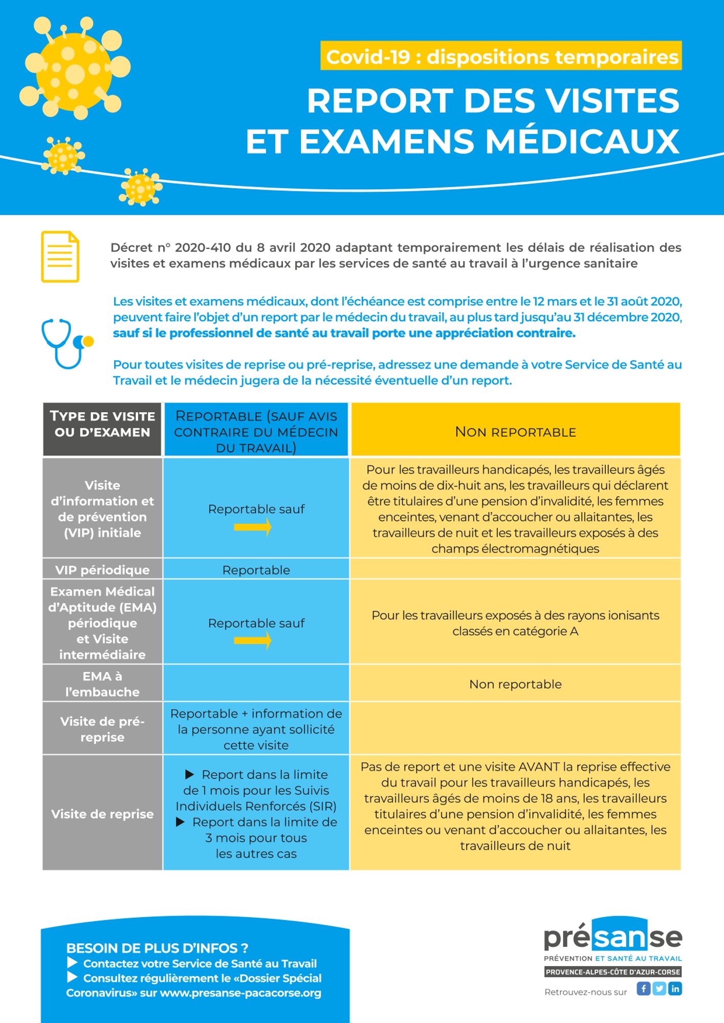 Les visites et examens médicaux, dont l’échéance est comprise entre le 12 mars et le 31 août 2020, peuvent faire l’objet d’un report par le médecin du travail, au plus tard jusqu’au 31 décembre 2020, sauf si le professionnel de santé au travail porte une appréciation contraire.