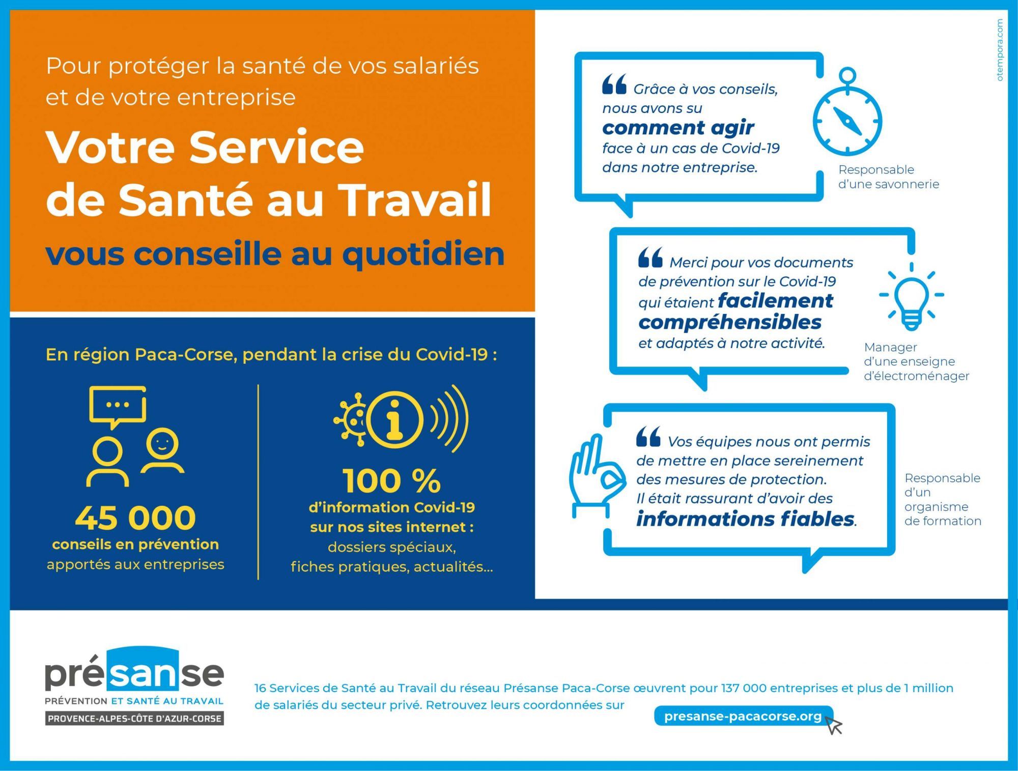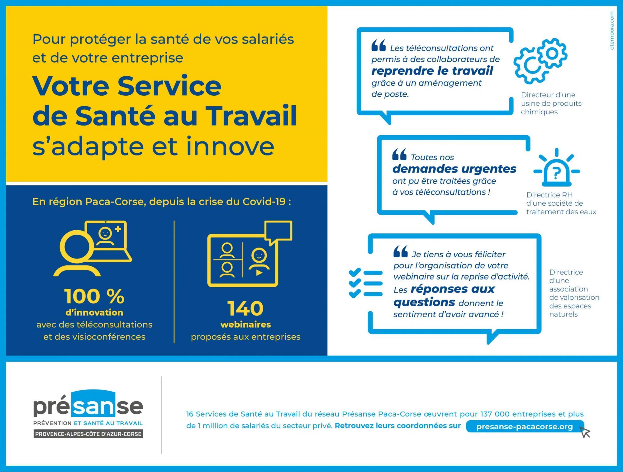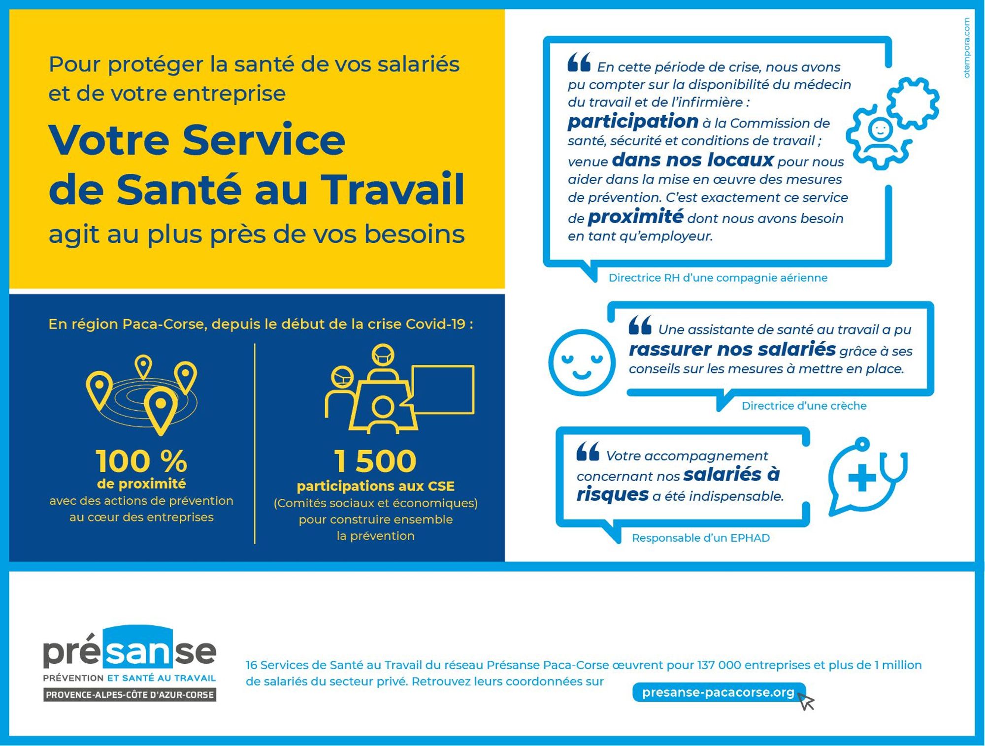 Depuis le début de la crise du Covid-19, pendant le confinement et après, les services de santé au travail en région Paca-Corse se mobilisent pour accompagner employeurs et salariés. Découvrez quelques témoignages d'entreprises adhérentes.