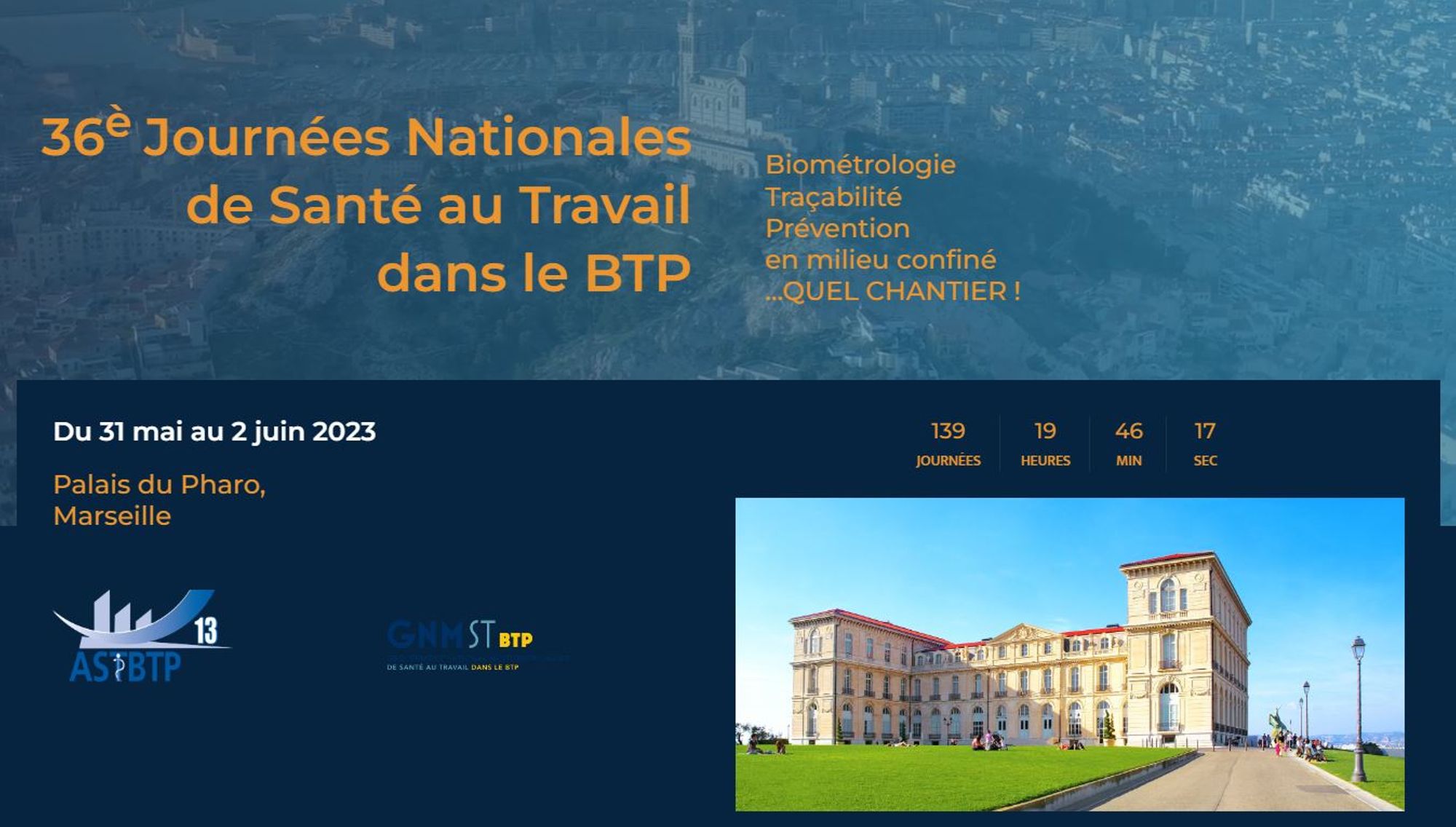 L'ASTBTP 13, membre de Présanse Paca-Corse, et le GNMST BTP (Groupement national multidisciplinaire de santé au travail dans le BTP) organisent les 36es Journées Nationales de la Santé au Travail dans le BTP, du 31 mai au 2 juin 2023 au Palais du Pharo à Marseille.