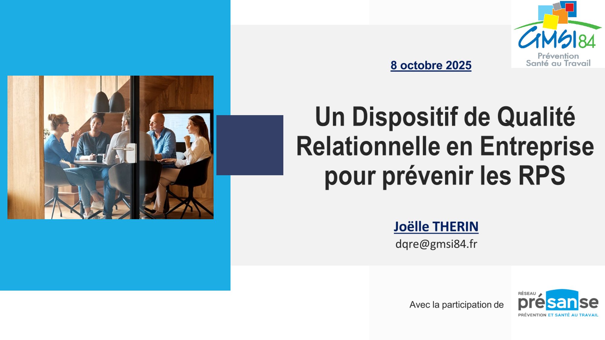 Lors des Journées Santé Travail 2025 du réseau Présanse, Joëlle Thérin, Présidente du GMSI84, a présenté le Dispositif Qualité Relationnelle en Entreprise (DQRE) mis en place depuis début 2023 pour accompagner les entreprises adhérentes dans leur appropriation de la culture de prévention, notamment sur le volet des risques psychosociaux.