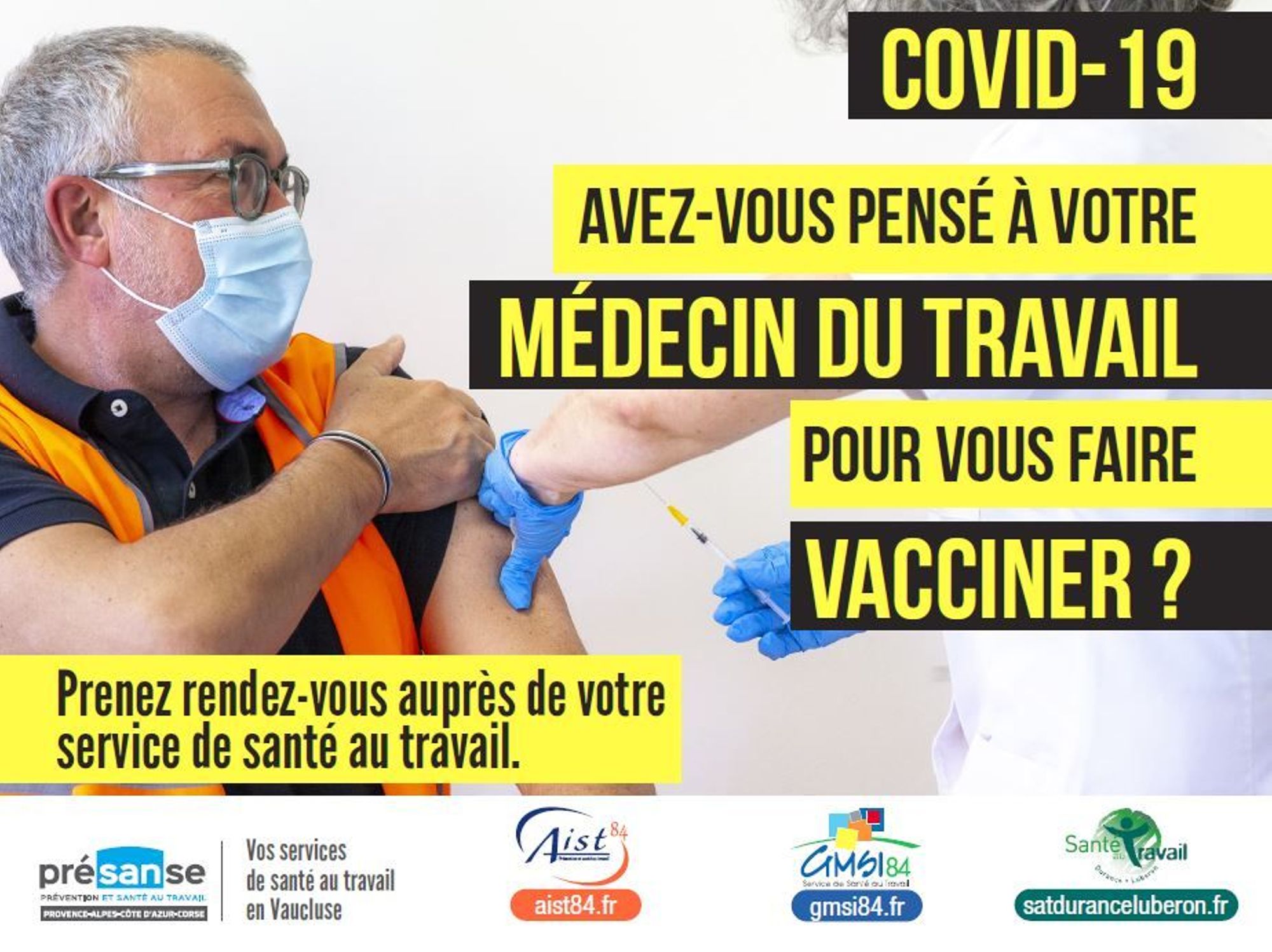 "Vous êtes salarié d’une entreprise ? Vous souhaitez vous faire vacciner contre la Covid-19 ? Faites appel à votre service de santé au travail. Dans le cadre de la stratégie vaccinale nationale, les équipes des services de santé au travail interentreprises de Paca sont mobilisées aux côtés des employeurs et de leurs salariés. Nos professionnels de santé peuvent vous vacciner selon les doses disponibles et les règles de priorité fixées par le gouvernement. Pour plus d’informations, contactez votre médecin du travail. Ensemble, luttons contre l’épidémie de Covid-19."