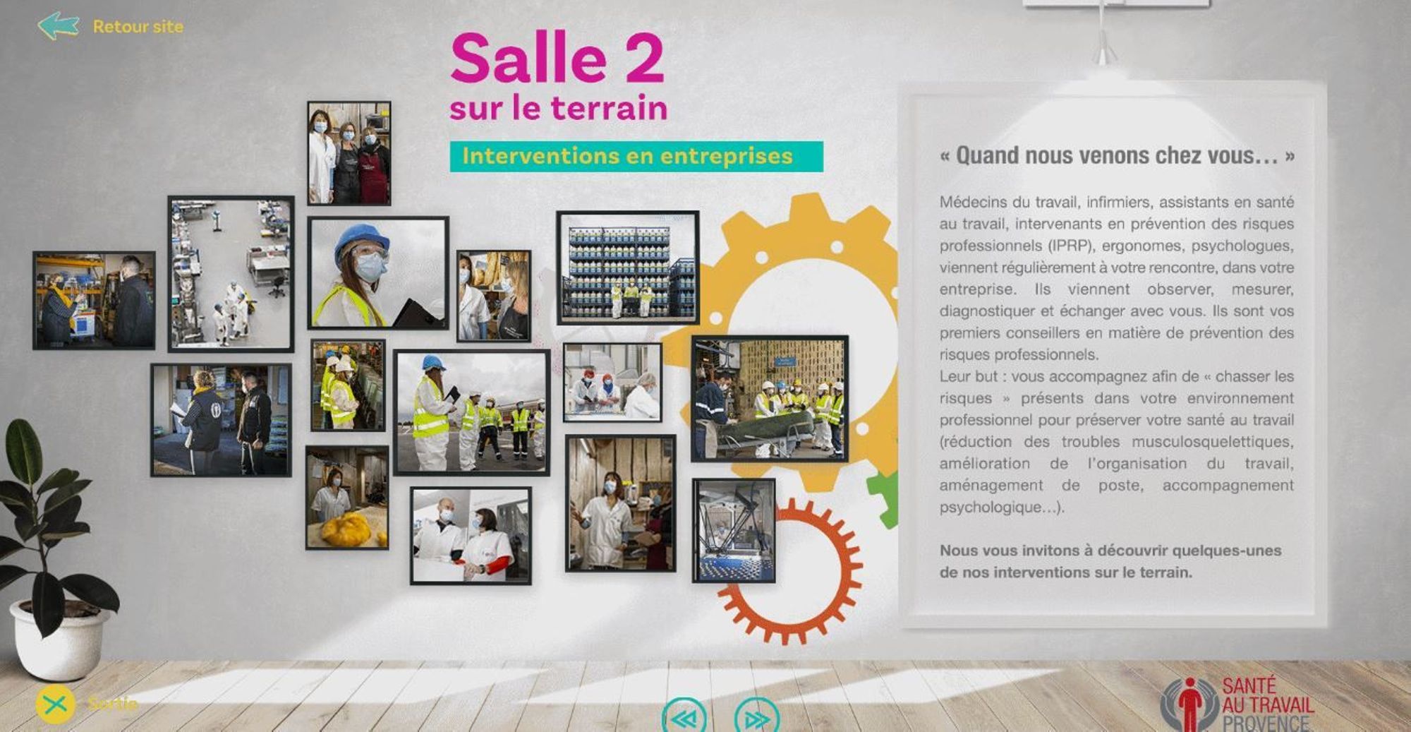 L'exposition démarre par le hall d’accueil virtuel, avant de découvrir la salle 1 "Nos centres médicaux" qui permet de faire connaissance avec les équipes, puis de rejoindre la salle 2 "Sur le terrain" qui montre les actions du ST-Provence au cœur des entreprises.