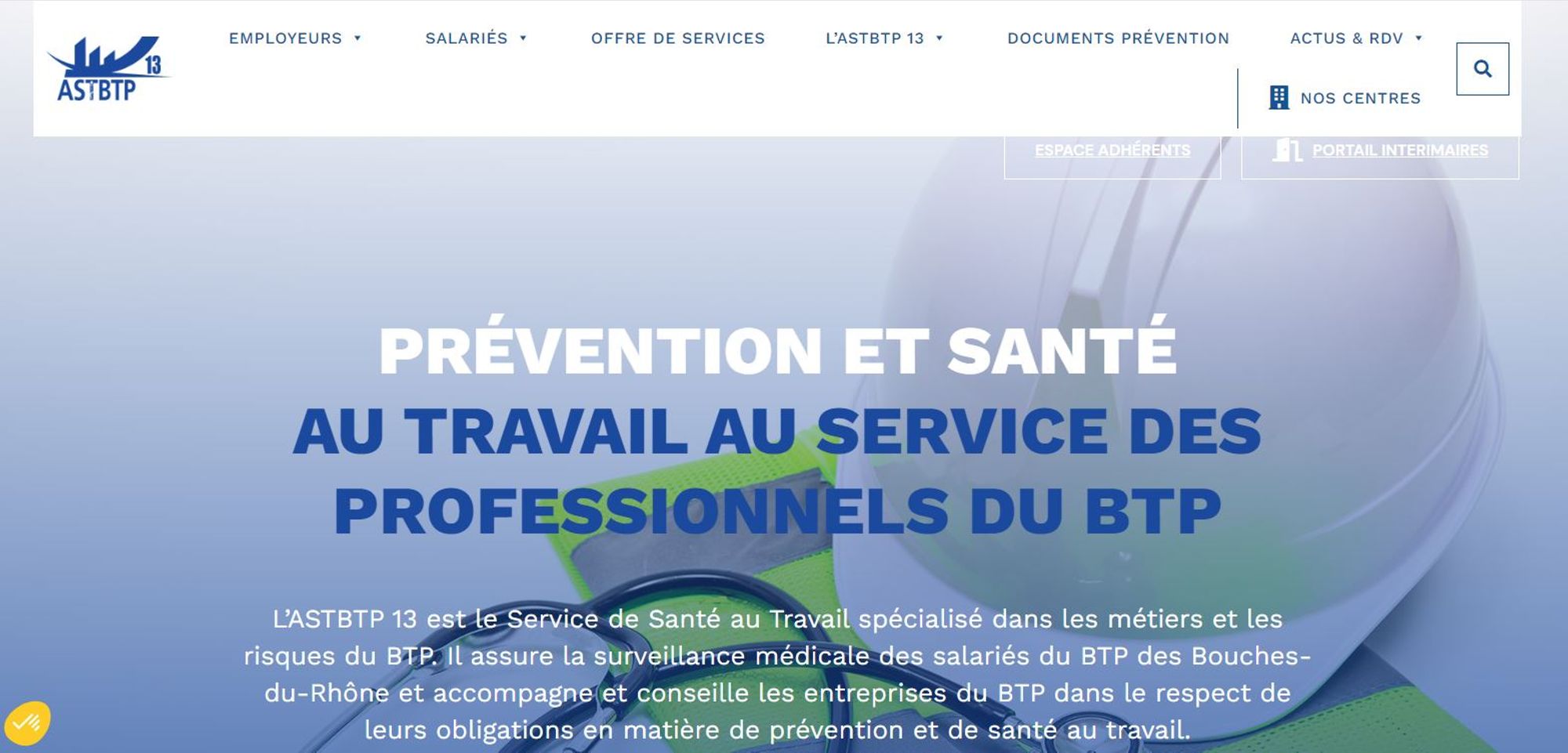 - Offre de services : l’ensemble des prestations proposées par l’ASTBTP 13 sont présentées et classées selon les 3 missions principales des SPST (Prévention des risques professionnels/Suivi individuel de l’état de santé/Prévention de la désinsertion professionnelle et maintien en emploi).