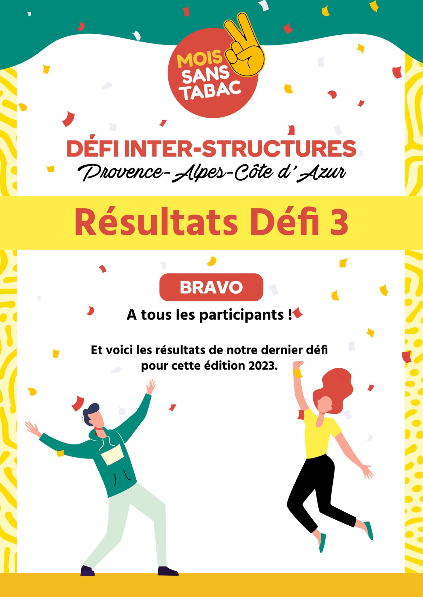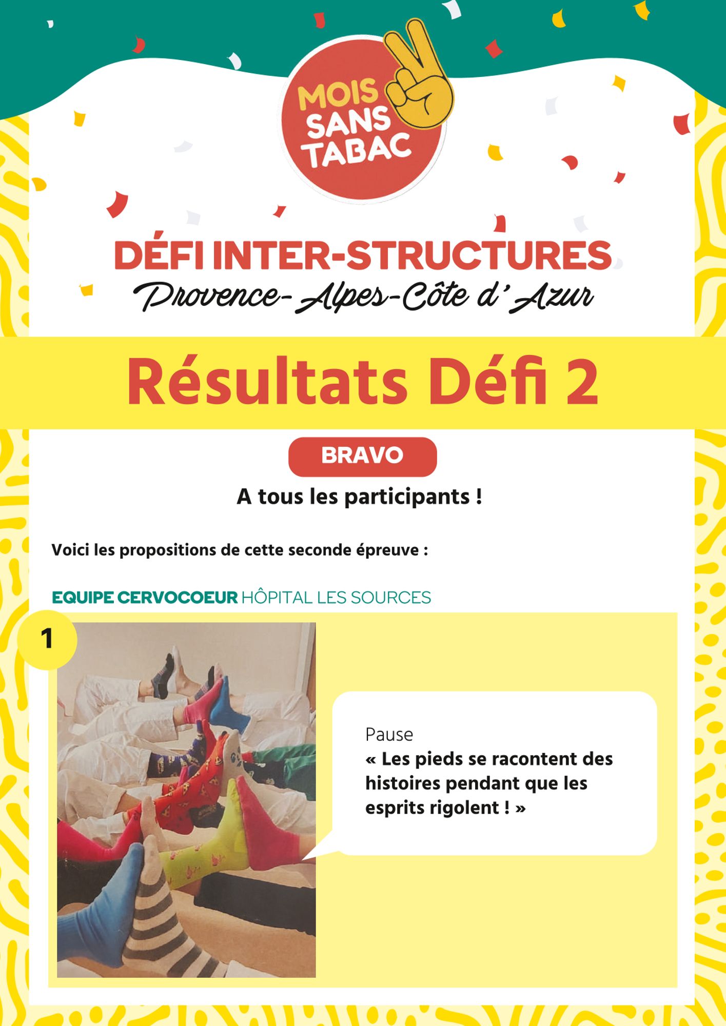 Parmi les SPSTI, l'AMETRA06 et l'AISMT 13 se sont lancés dans l'aventure. Présanse Paca-Corse a également joué le jeu avec une équipe composée de la chargée de communication et de collaborateurs d'Expertis. Pour le 3e défi, on notera ainsi que l'équipe de Présanse Paca-Corse, intitulée "OCL Premium", s'est hissée sur la 1ère marche du podium avec un visuel qui répondait au défi suivant : créer une affiche avec un slogan pour soutenir l'arrêt du tabac et comportant la photo d'au moins deux membres de l'équipe.