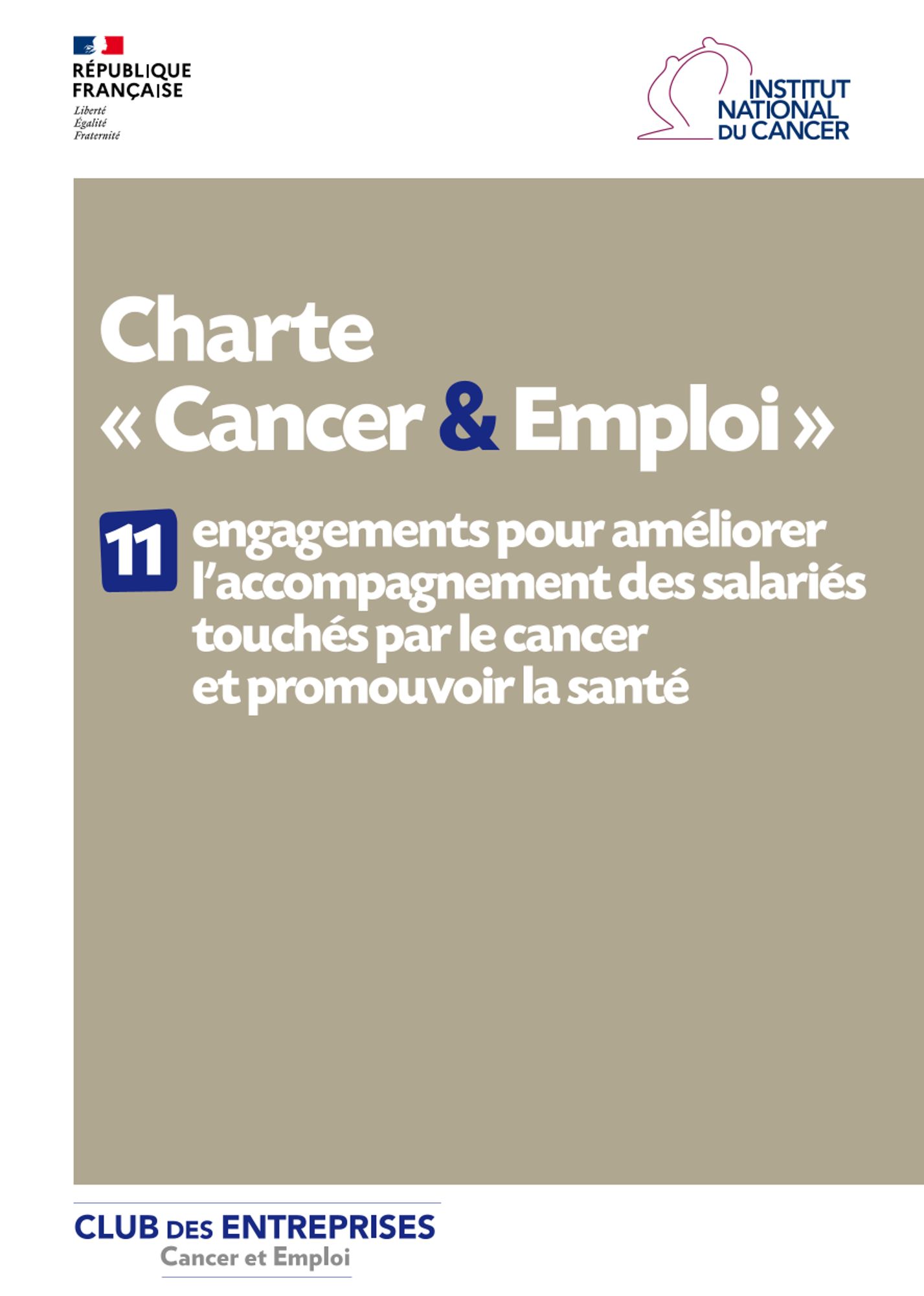 L’Institut national du cancer (INCa) s’engage pour améliorer les conditions de travail des personnes touchées par la maladie. Dans le cadre du Club des entreprises, animé par l’INCa, l’Association nationale des DRH (ANDRH) et l’Agence nationale pour l’amélioration des conditions de travail (Anact), une charte pour les entreprises a été lancée. Elle vise à fédérer celles et ceux qui souhaitent agir sur la perception de la maladie dans l’univers professionnel et à développer des approches collectives permettant de mieux prendre en considération les attentes spécifiques des personnes touchées par un cancer et celles des entreprises.