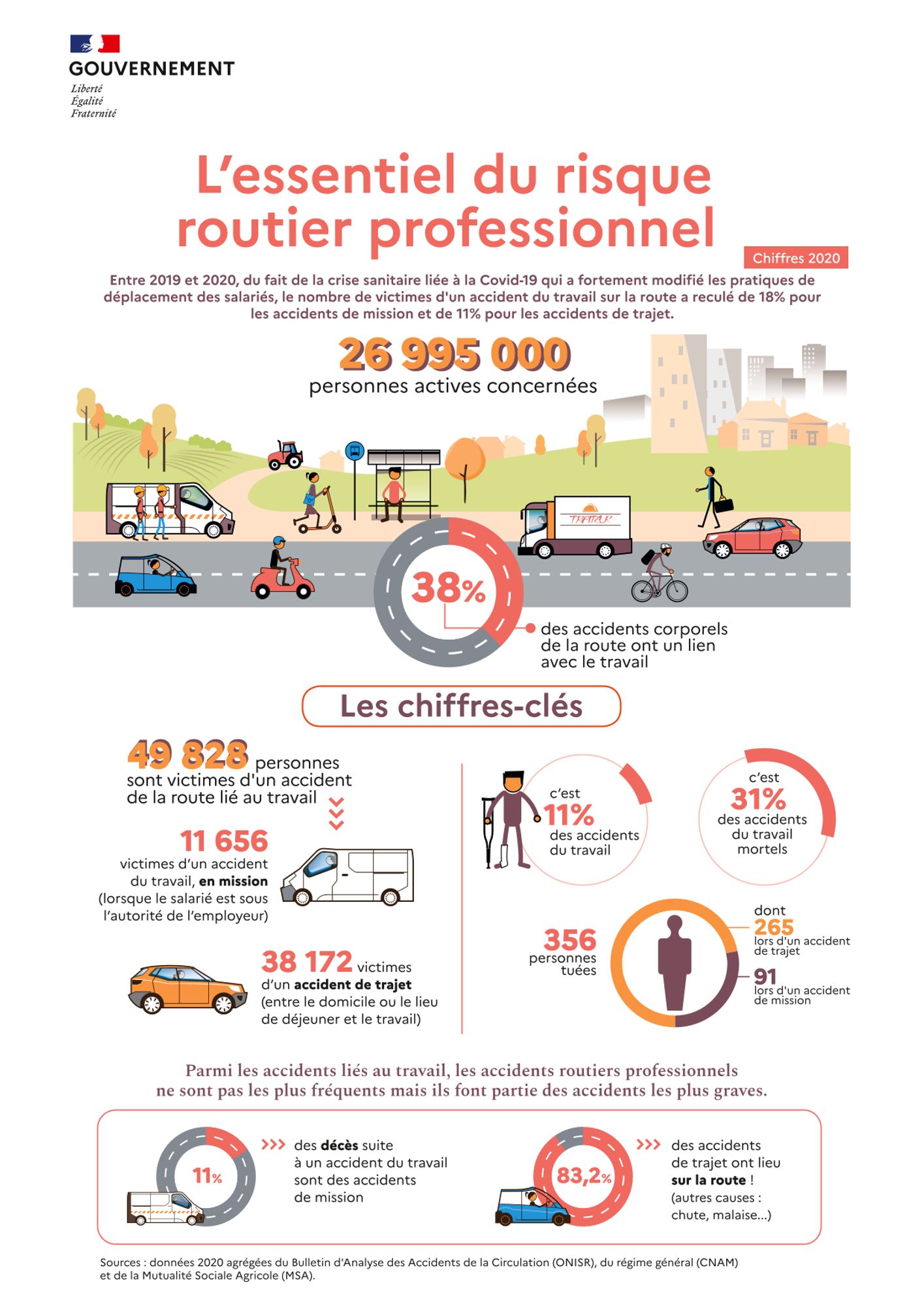 En 2020, 356 personnes ont été tuées en raison d'un accident routier professionnel (accidents de trajet ou de mission). Le chiffre est en légère baisse par rapport à 2019 (406), mais ceci s'explique par la crise sanitaire liée à la Covid-19 et les épisodes de confinement. Le risque routier professionnel demeure important. D'autant qu'au-delà des décès, ces accidents peuvent avoir des conséquences graves pour la santé des salariés. Ils sont aussi facteurs de désorganisation pour les entreprises.