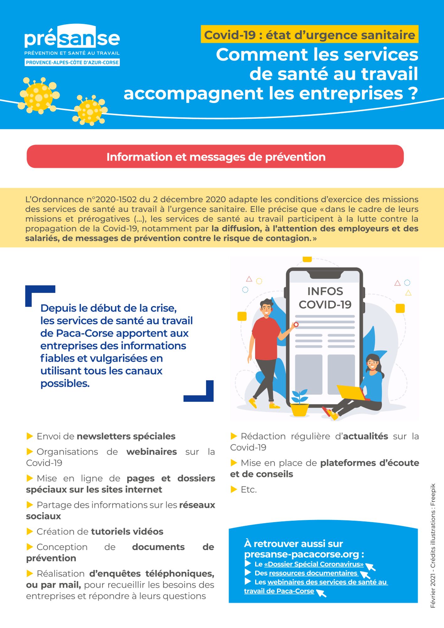 - assurent leur rôle de conseillers des entreprises en proposant des solutions techniques et organisationnelles face à l’épidémie de Covid-19.