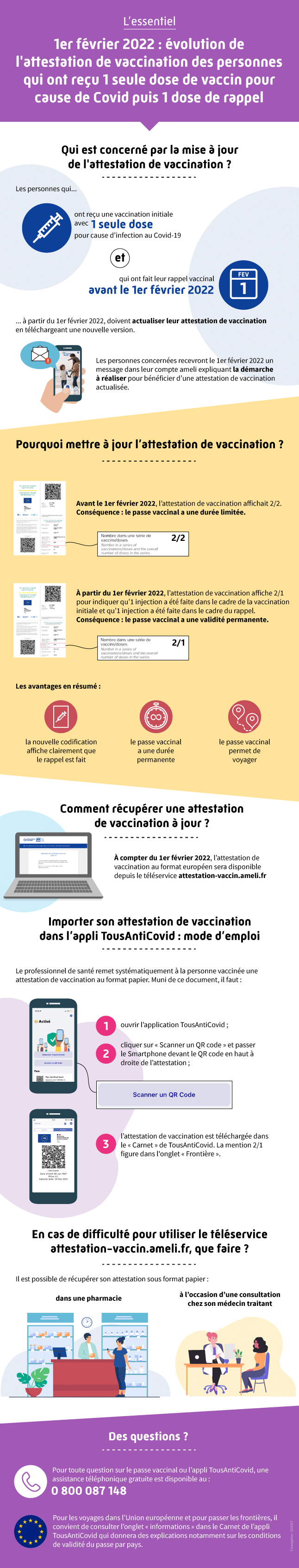 Depuis le 1er février 2022, les personnes qui ont reçu une dose de vaccin avant ou après une infection à la Covid-19 puis une dose de rappel avant le 1er février 2022 doivent mettre à jour leur attestation de vaccination pour garder un pass vaccinal valide. Cette démarche est rendue obligatoire par une évolution réglementaire au niveau européen.