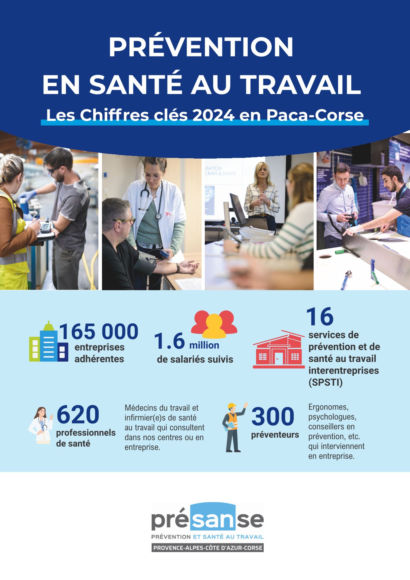 Pour la première fois, Présanse Paca-Corse dévoile un tableau de bord régional des “Chiffres clés 2024”, sous la forme d'un livret synthétique de 4 pages qui traduit l’activité des 16 services de prévention et de santé au travail interentreprises (SPSTI) de Provence-Alpes-Côte d’Azur et de Corse.