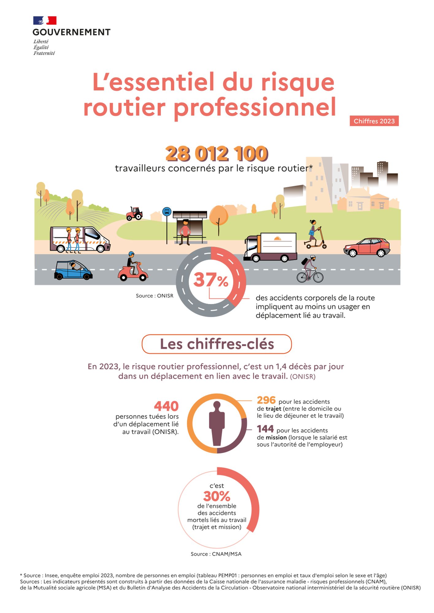 L'infographie initulée "L’Essentiel du risque routier professionnel" présente des éléments statistiques issus de l’exploitation des données d’indemnisation des accidents du travail et des accidents de trajet des deux principaux régimes de Sécurité sociale, le régime général et le régime des salariés affiliés à la MSA, ainsi que des données sur les accidents corporels de la circulation routière directement recueillies sur les lieux de l'accident par les forces de l’ordre centralisées par l’ONISR.