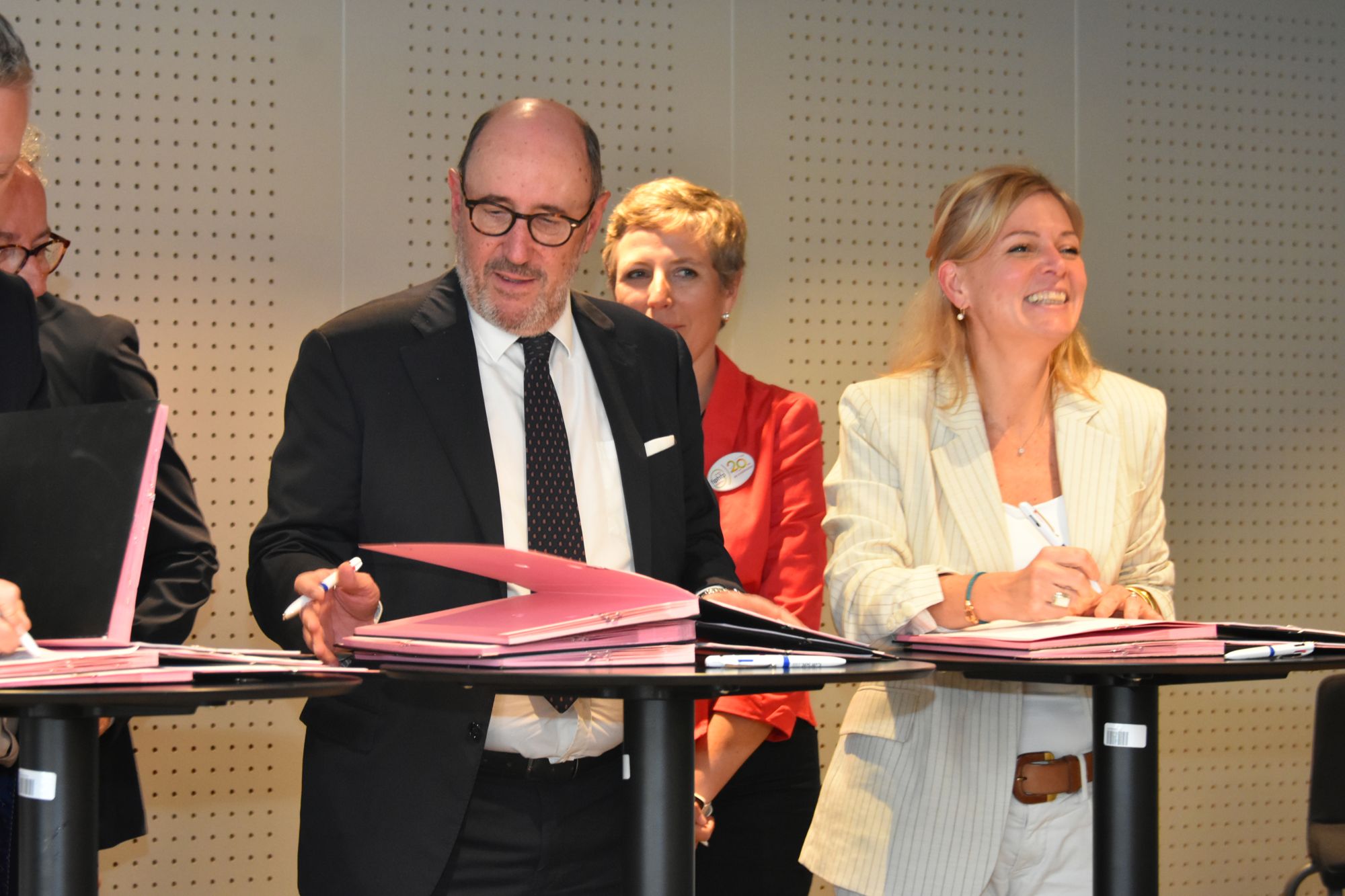 La signature de la charte régionale de coopération sur le maintien dans l’emploi s'est déroulée en présence de M. Bernard RATTO, président de CHEOPS PACA – réseau des Cap emploi, M. Vincent VERLHAC, directeur général de la Carsat Sud-Est, Mme Séverine BAUDOUIN, directrice adjointe du FIPHFP, M. Sébastien DEBEAUMONT, directeur régional de la DREETS Provence-Alpes-Côte d’Azur, Mme Caroline DEKERLE, directrice générale de l’Agefiph, M. Christophe VAILLE, représentant de l’Association régionale des caisses de Mutualité sociale agricole de la région PACA, et M. Hervé de VEYRAC, président de Présanse PACA Corse.