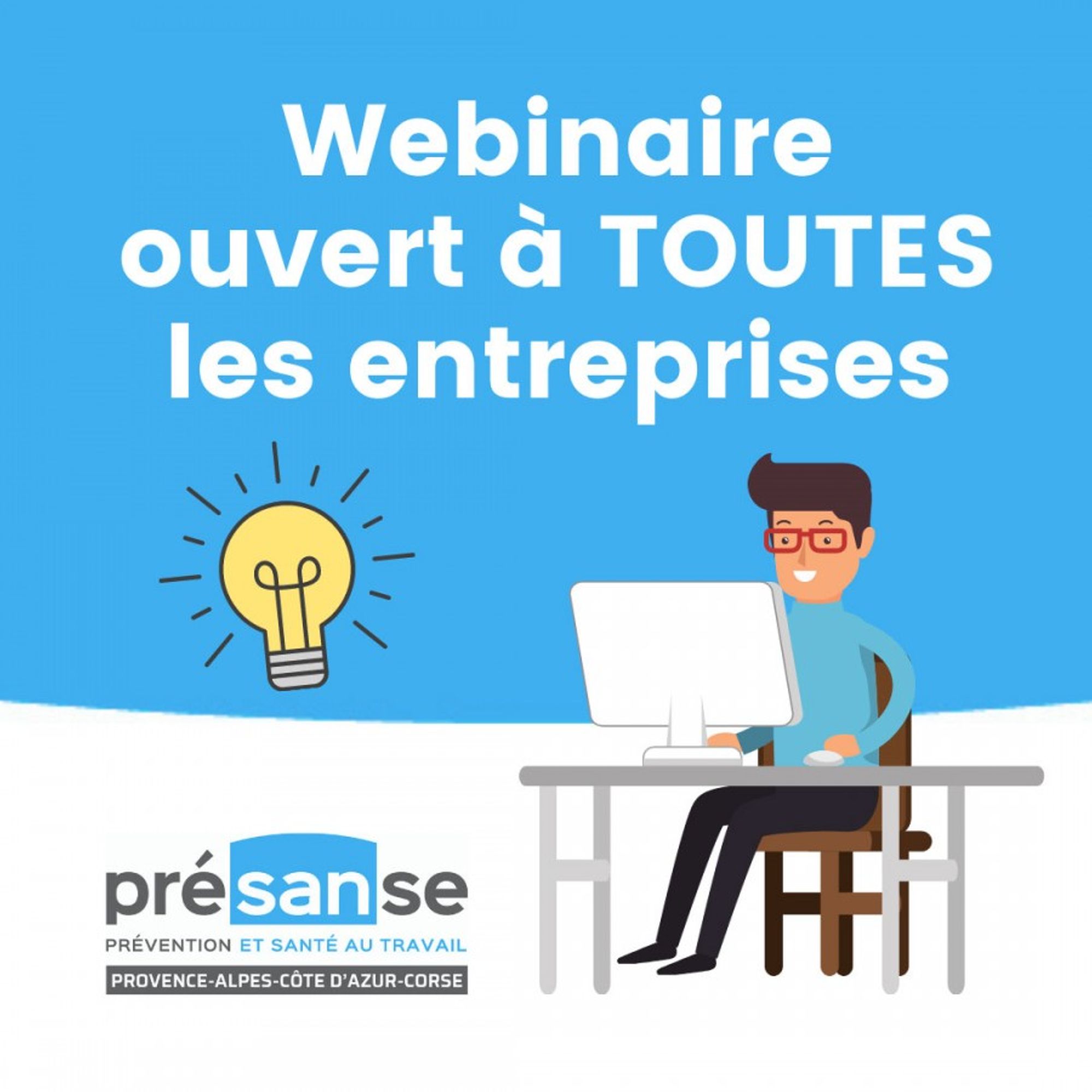 A noter que certains webinaires sont communs à tous les Services de Prévention et de Santé au Travail de Présanse Paca-Corse et sont donc ouverts à toutes les entreprises, quel que soit leur Service de Prévention et de Santé au Travail d'adhésion. Ils sont identifiables par ce visuel "Webinaire ouvert à TOUTES les entreprises".