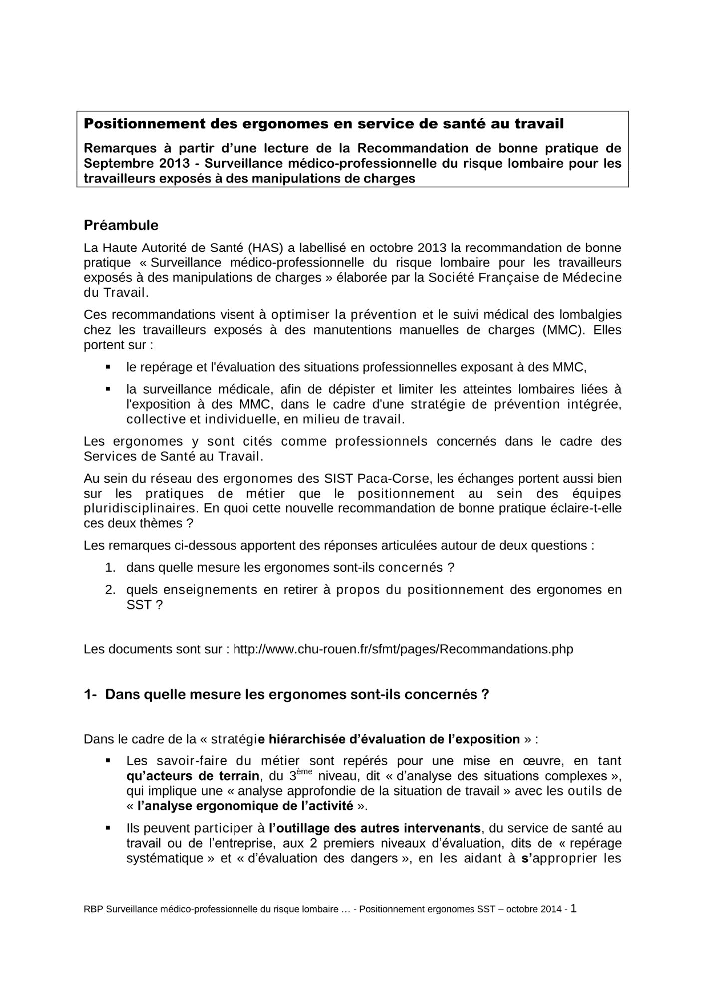 Les ergonomes des services de santé au travail sont également impliqués dans la surveillance du risque lombaire pour les travailleurs exposés à des manipulations de charge, une action reconnue par la Société Française de Médecine du Travail et labellisée par la Haute Autorité de Santé (HAS).