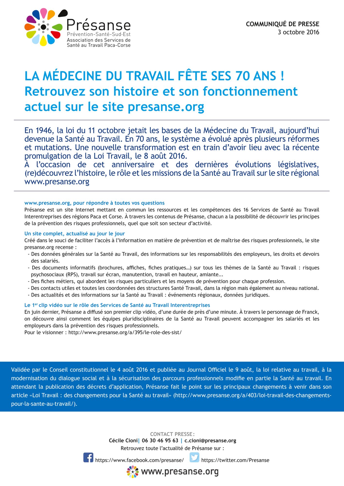 [03/10/2016 Communiqué] La médecine du travail fête ses 70 ans !