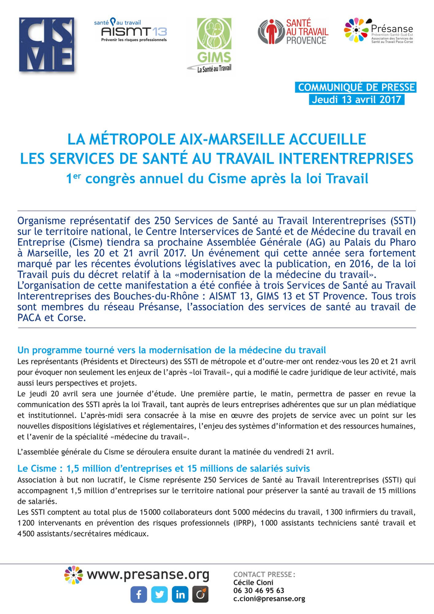 Organisme représentatif des 250 Services de Santé au Travail Interentreprises (SSTI) sur le territoire national, le Centre Interservices de Santé et de Médecine du travail en Entreprise (Cisme) tiendra sa prochaine Assemblée Générale (AG) au Palais du Pharo à Marseille, les 20 et 21 avril 2017. Un événement qui cette année sera fortement marqué par les récentes évolutions législatives avec la publication, en 2016, de la loi Travail puis du décret relatif à la "modernisation de la médecine du travail". L'organisation de cette manifestation a été confiée à trois Services de Santé au Travail Interentreprises des Bouches-du-Rhône : AISMT 13, GIMS 13 et ST Provence. Tous trois sont membres du réseau Présanse, l'association des services de santé au travail de PACA et Corse.