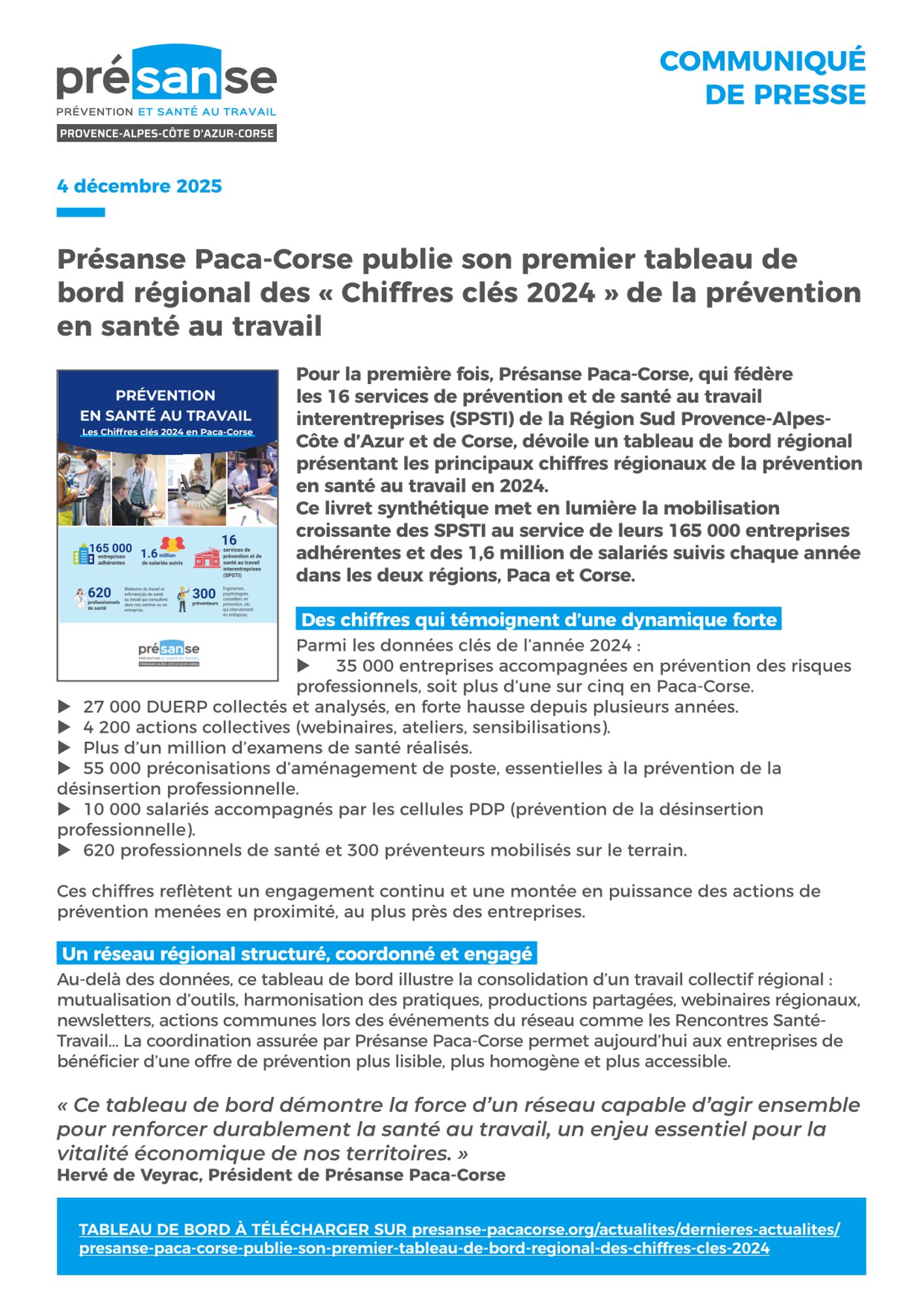 "Ce tableau de bord démontre la force d’un réseau capable d’agir ensemble pour renforcer durablement la santé au travail, un enjeu essentiel pour la vitalité économique de nos territoires."