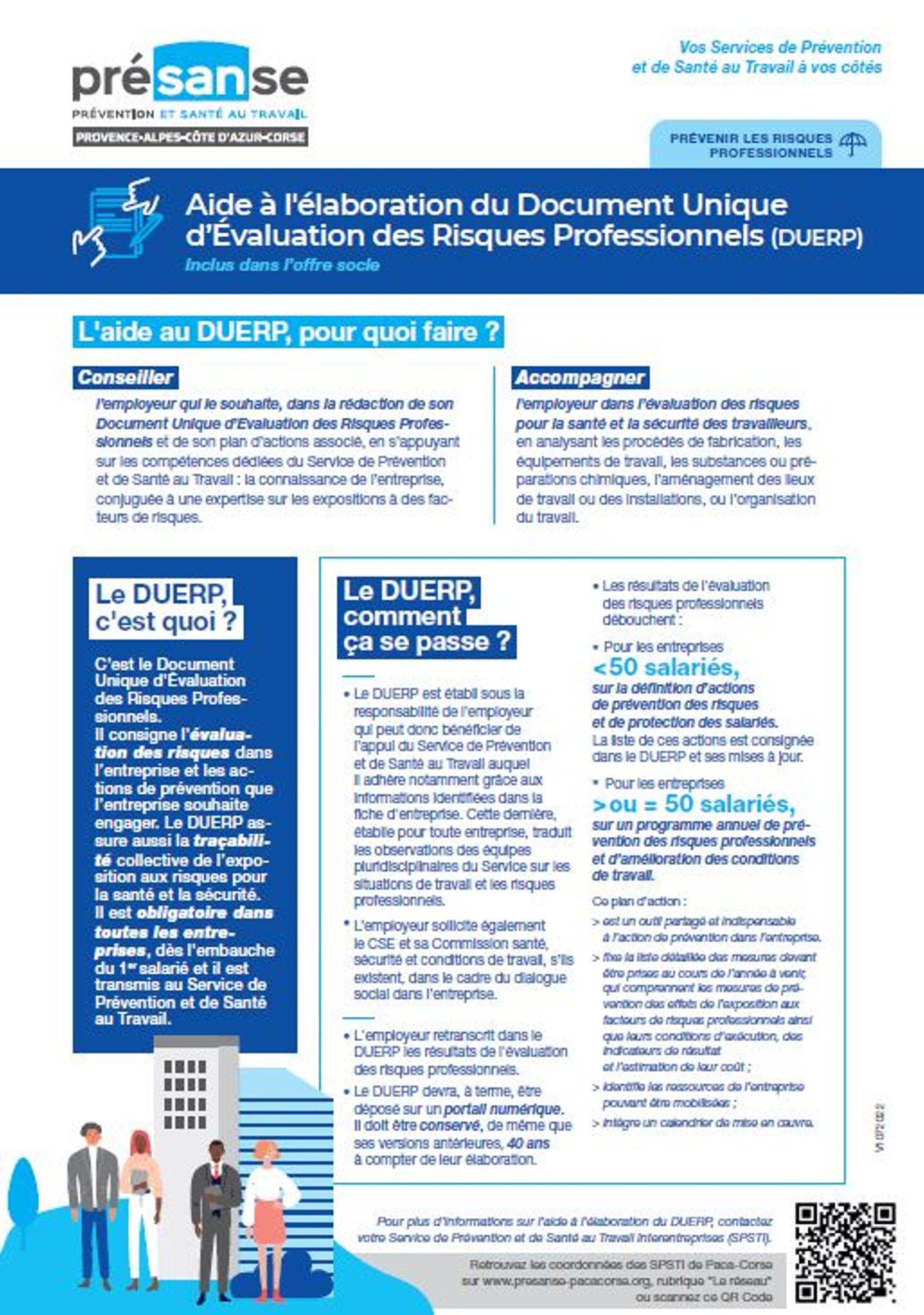 Le DUERP, c'est le Document Unique d'Évaluation des Risques Professionnels. Il consigne l'évaluation des risques dans l’entreprise et les actions de prévention que l’entreprise souhaite engager. Le DUERP assure aussi la traçabilité collective de l’exposition aux risques pour la santé et la sécurité. Il est obligatoire dans toutes les entreprises, dès l'embauche du 1er salarié et il est transmis au Service de Prévention et de Santé au Travail.