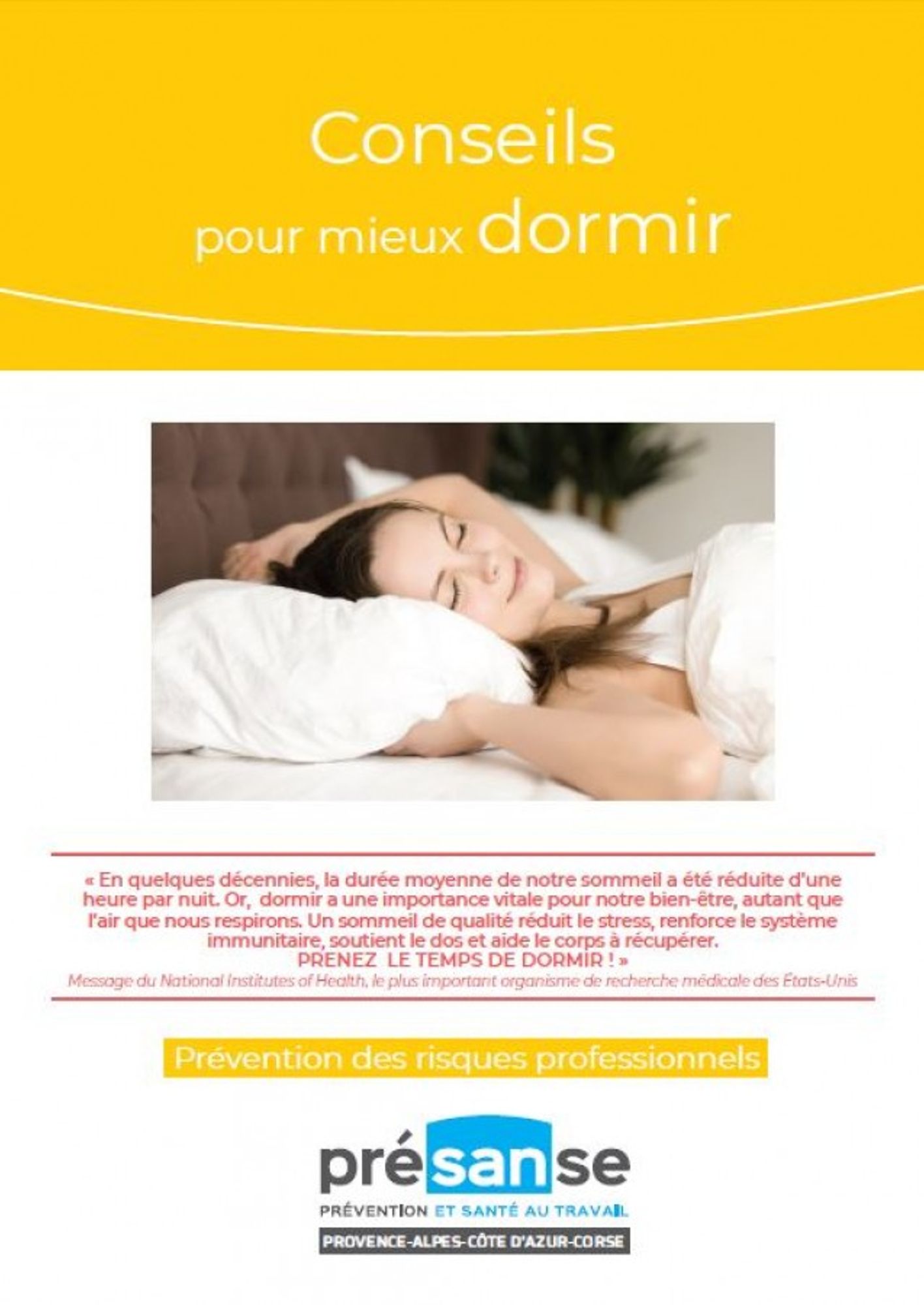 "En quelques décennies, la durée moyenne de notre sommeil a été réduite d’une heure par nuit. Or, dormir a une importance vitale pour notre bien-être, autant que l’air que nous respirons. Un sommeil de qualité réduit le stress, renforce le système immunitaire, soutient le dos et aide le corps à récupérer. PRENEZ LE TEMPS DE DORMIR !" (Message du National Institutes of Health, le plus important organisme de recherche médicale des États-Unis)