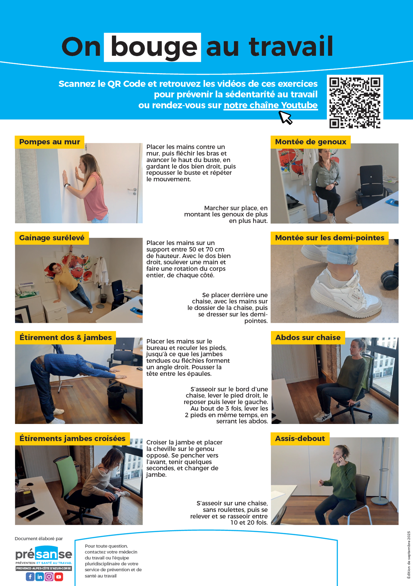 Sur cette affiche, à placer dans toutes les entreprises où le travail de bureau est présent, retrouvez 8 de nos exercices pour prévenir la sédentarité au travail. Et pour aller plus loin, scannez le QR Code présent sur l'affiche et visionnez les exercices en vidéo, avec deux exos en bonus.